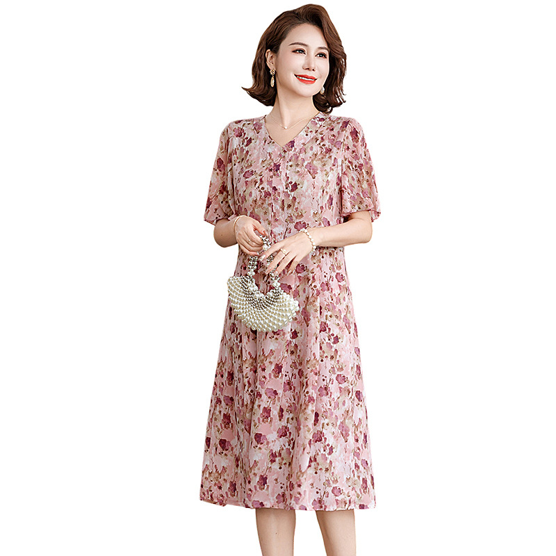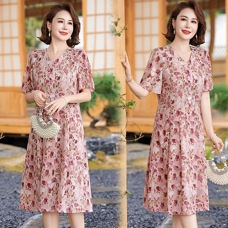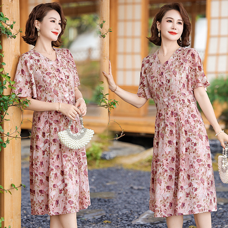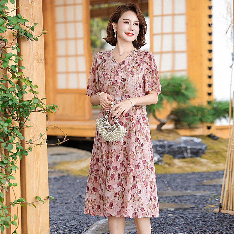 | nameOriginal | Middle-aged mother's summer floral chiffon belly-covering slimming dress middle-aged and elderly women's summer western-style short-sleeved skirt |