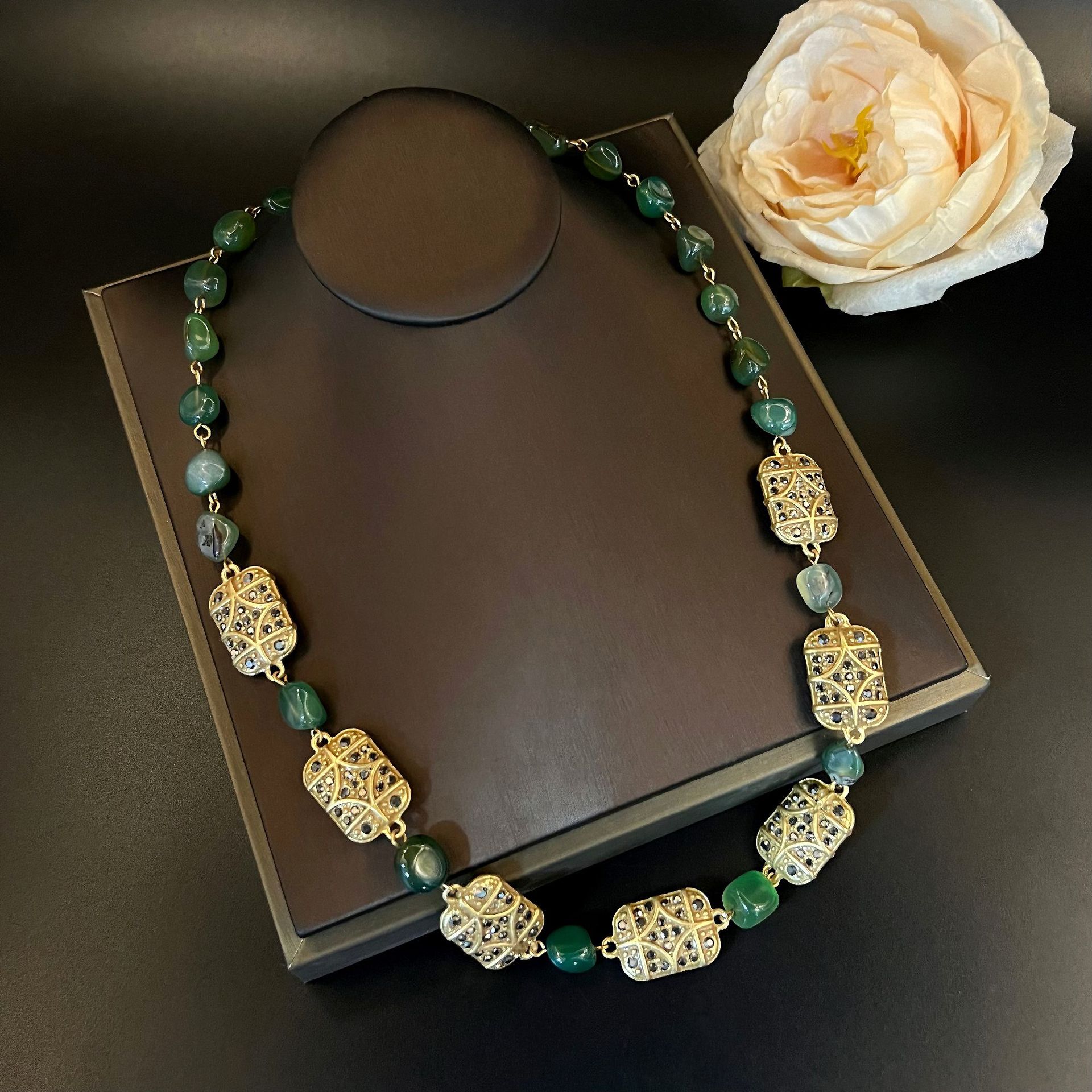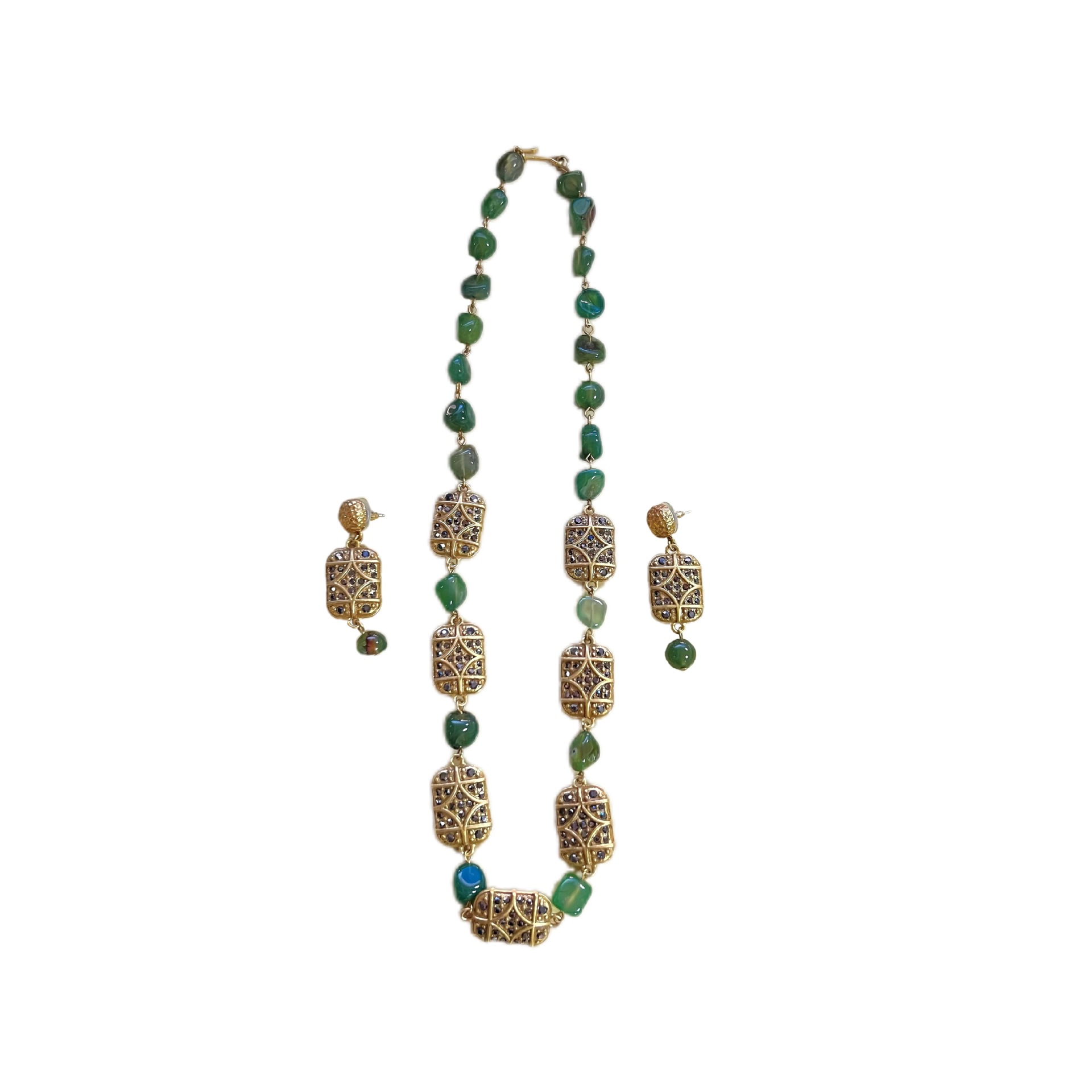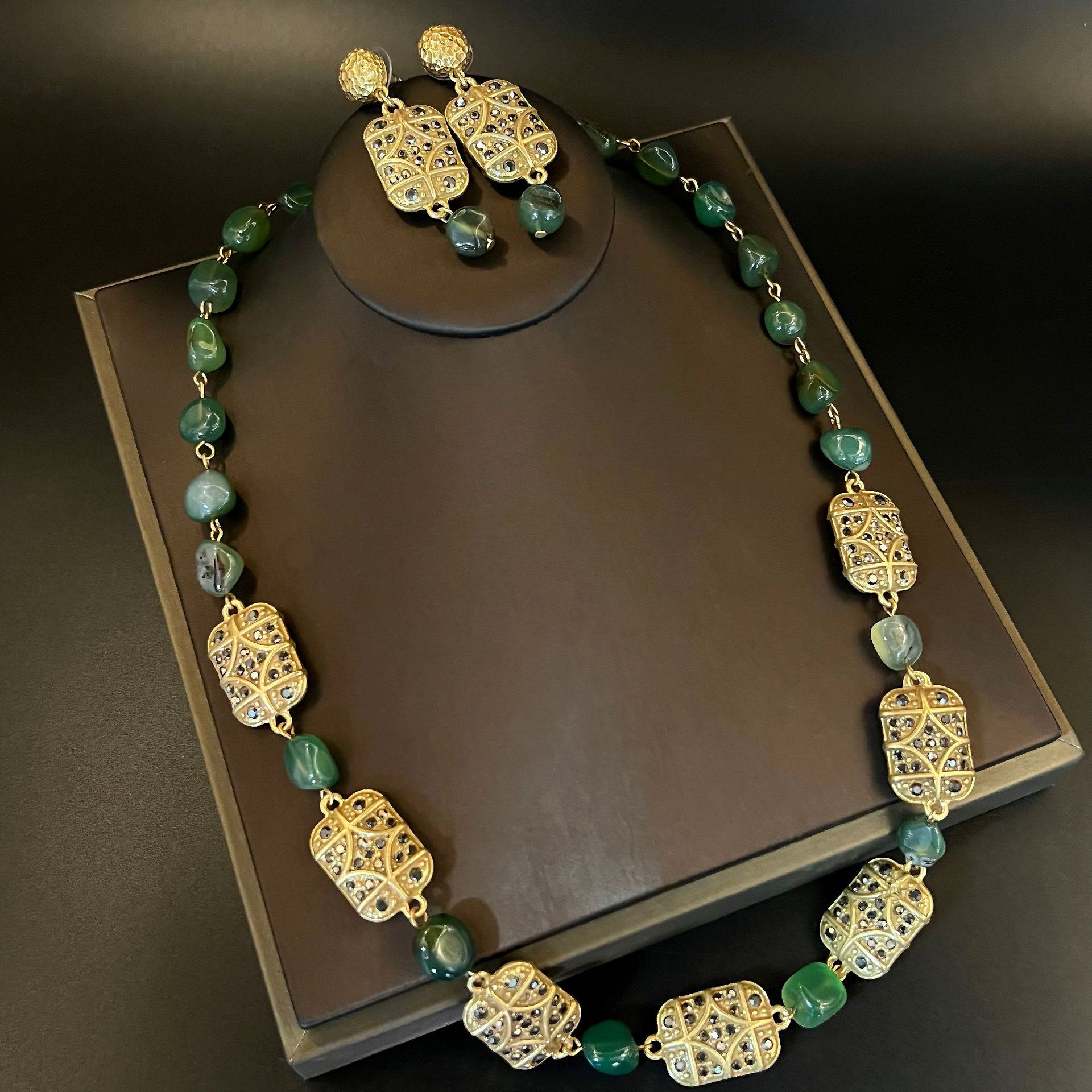 Middle Ancient Retro High-grade French Gold-plated Green Agate Necklace Earrings New Chinese Style Diamond-encrusted Niche Elegant Jewelry suit
