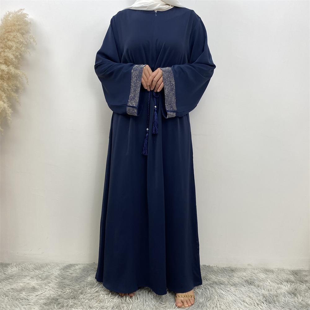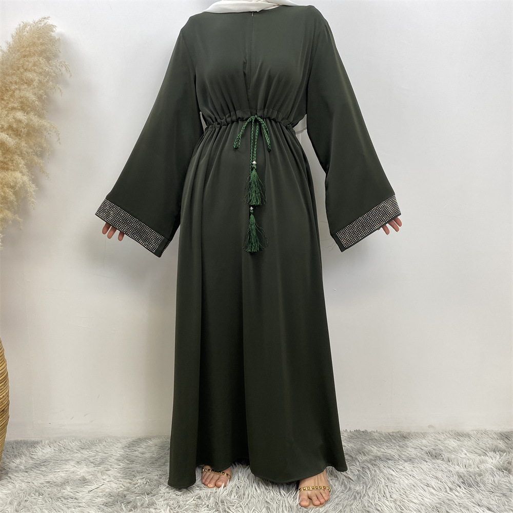Middle East Muslim fashion women’s hot rhinestone stitching lace-up dress with pocket robe 6758