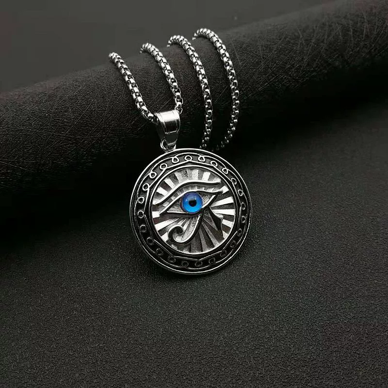 | nameOriginal | Middle East popular new personalized Egyptian Eye of Horus jewelry titanium steel gold-plated blue eyes round pendant necklace |