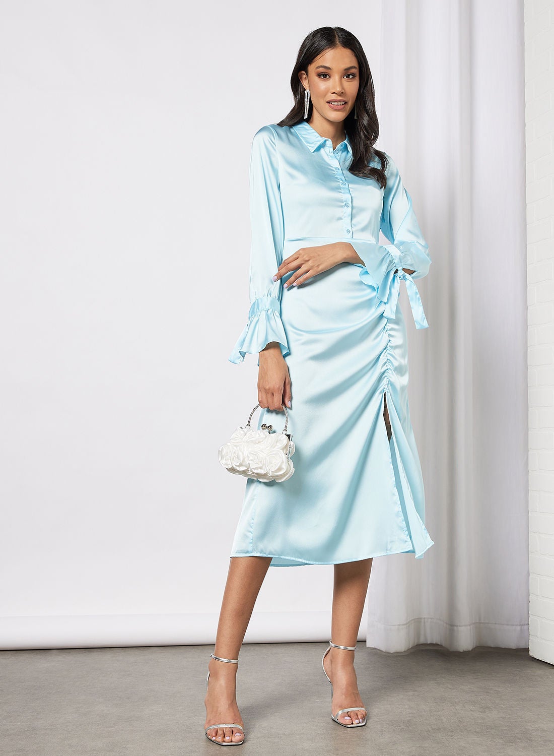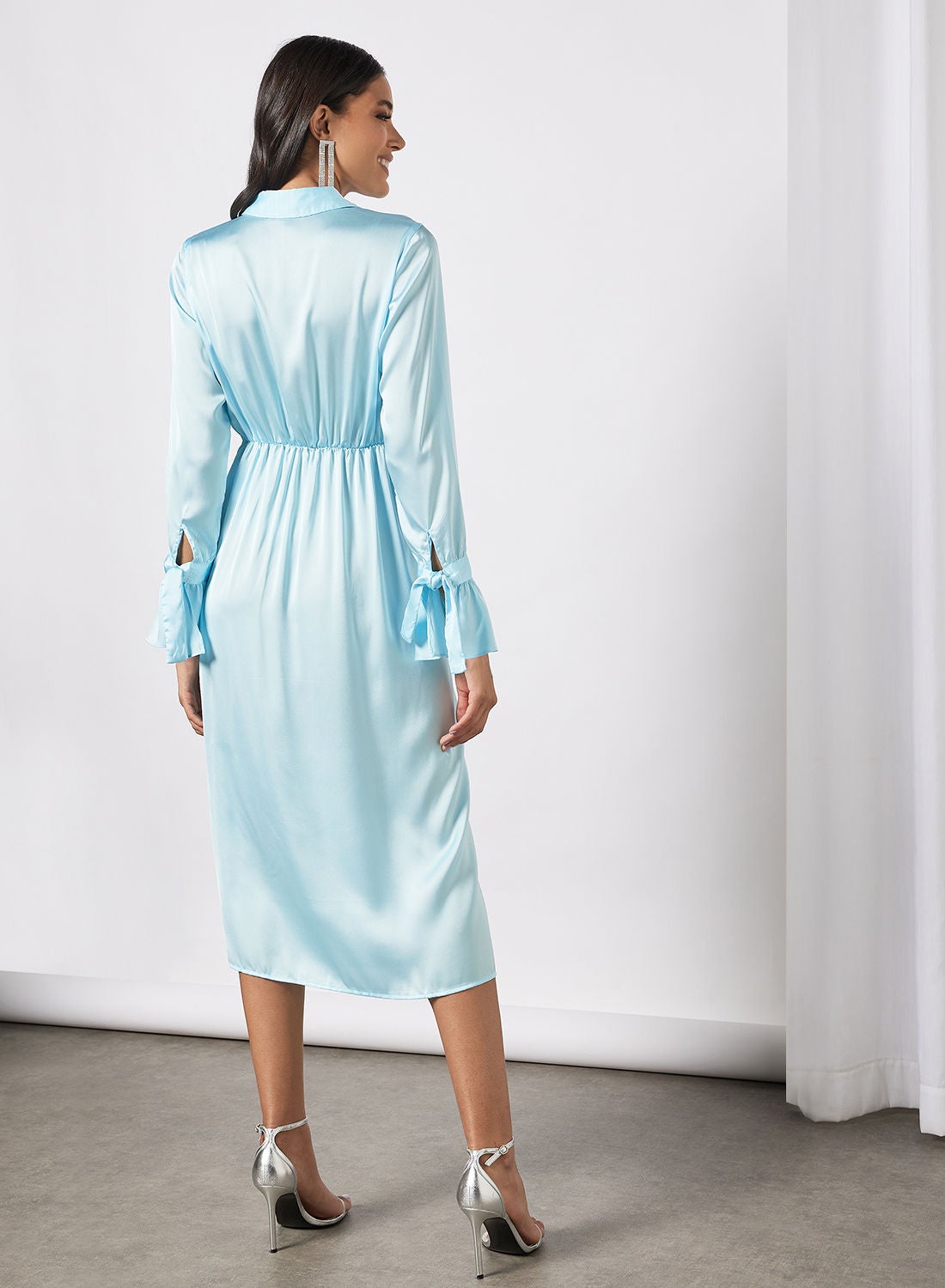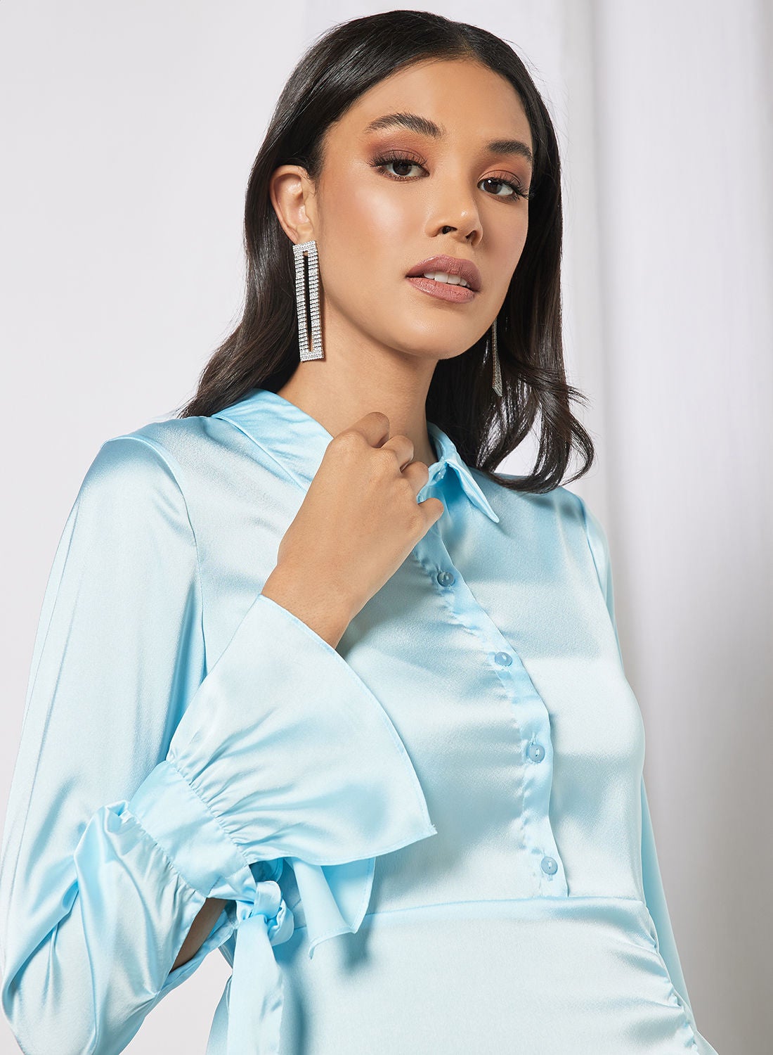 This product features a smooth and silky polyester material with a collar and long sleeves. The front has a hidden button closure and the side has a gathered detail. The sleeves can be tied up for added style. Please follow the care label instructions when washing. The model is approximately 178cm tall and is wearing a size S.