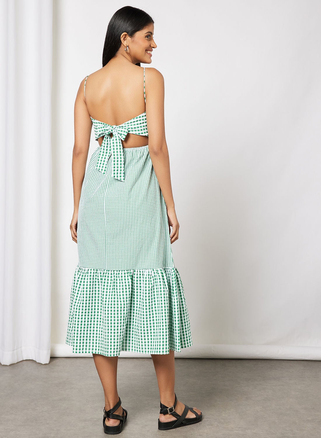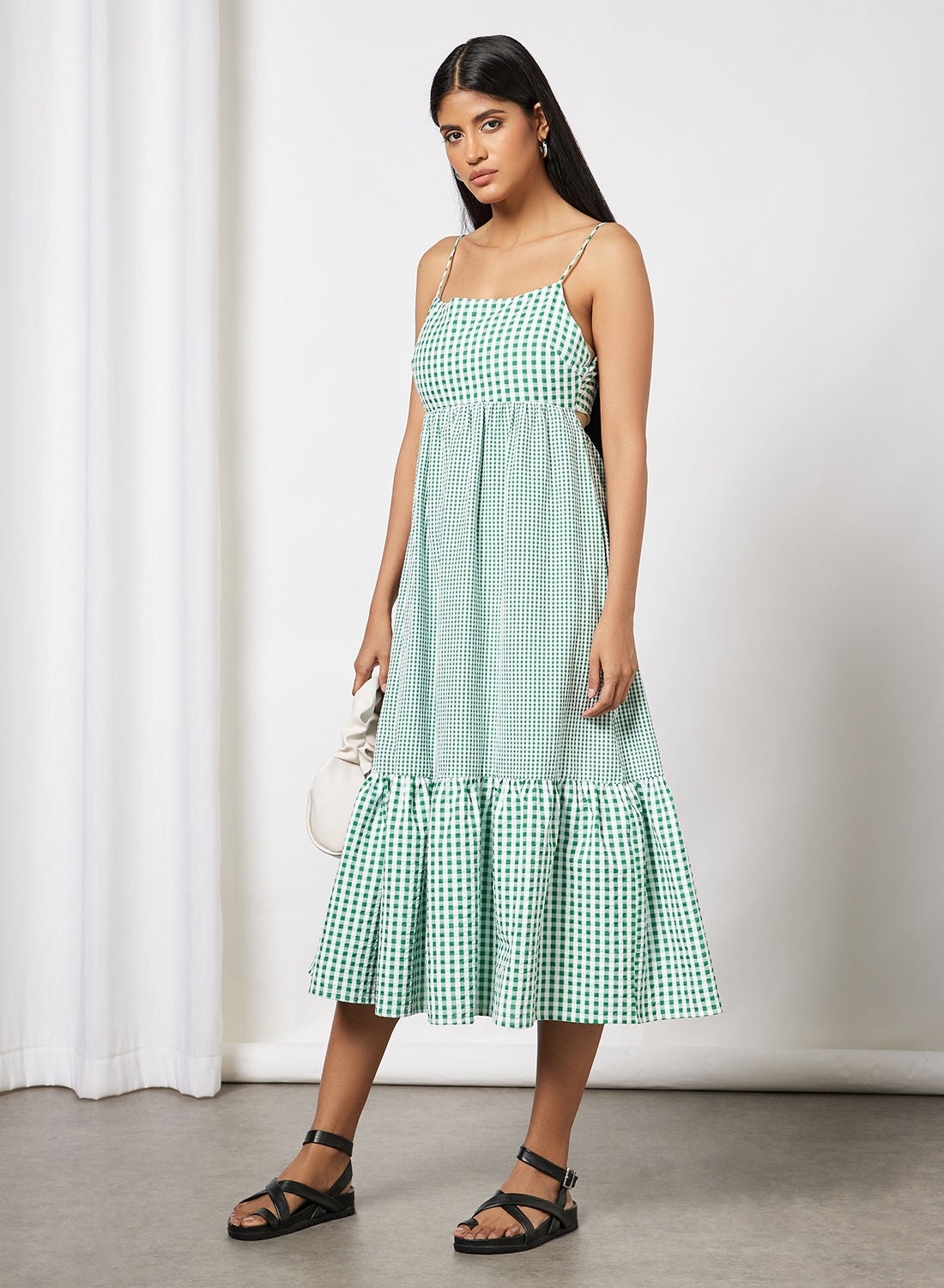 This product is a part of Mango’s Committed collection and is made of a textured blend of polyester fabric. It features a checkered pattern all over and has a square neck with slim shoulder straps. The back has self-tie straps and the product has a relaxed fit with a midi length. It is recommended to follow the care label instructions while washing. The model wearing the product is approximately 180cm tall and is wearing size S.