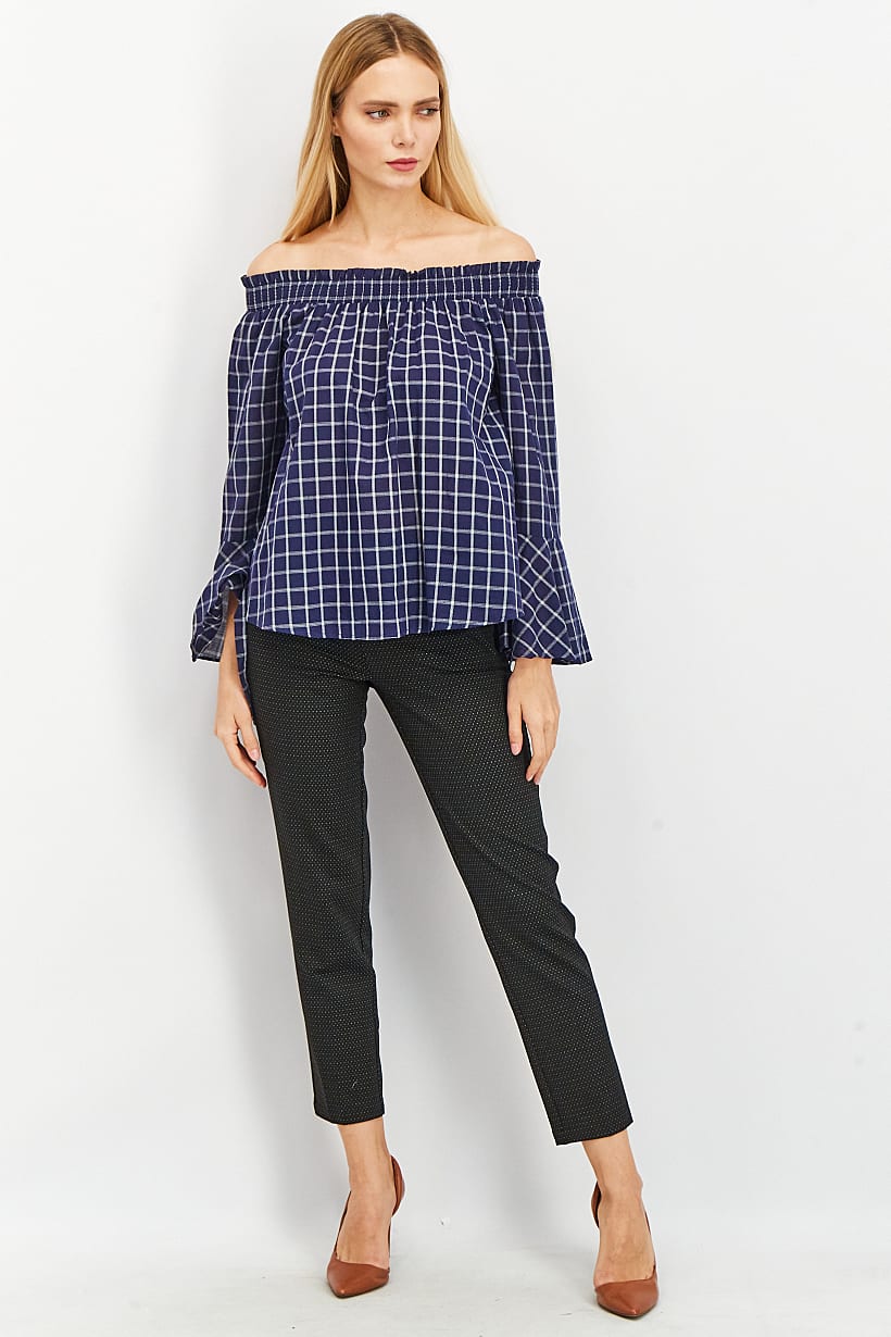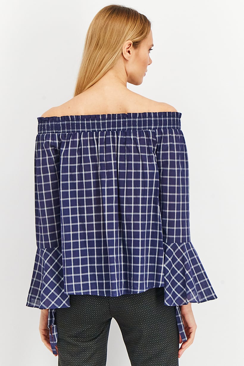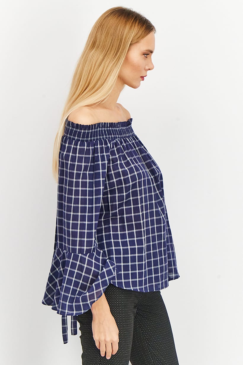 | descriptionOriginal | Care : Machine washable, Fit : Regular fit, Ideal For : Women, Size shown : International, Top Style : Blouse, Types of Hem : Curved hem, Types of Neckline & Collar : Off-shoulder neckline, Types of Sleeve : Longsleeve, Disclaimer : Product color may slightly vary due to photographic lighting sources or your monitor settings., Fabrics : 100% Polyester, Occasion : Casual, Pattern & Print : Windowpane pattern, Types of Closures : Pullover, Color Family : Navy Blue, |