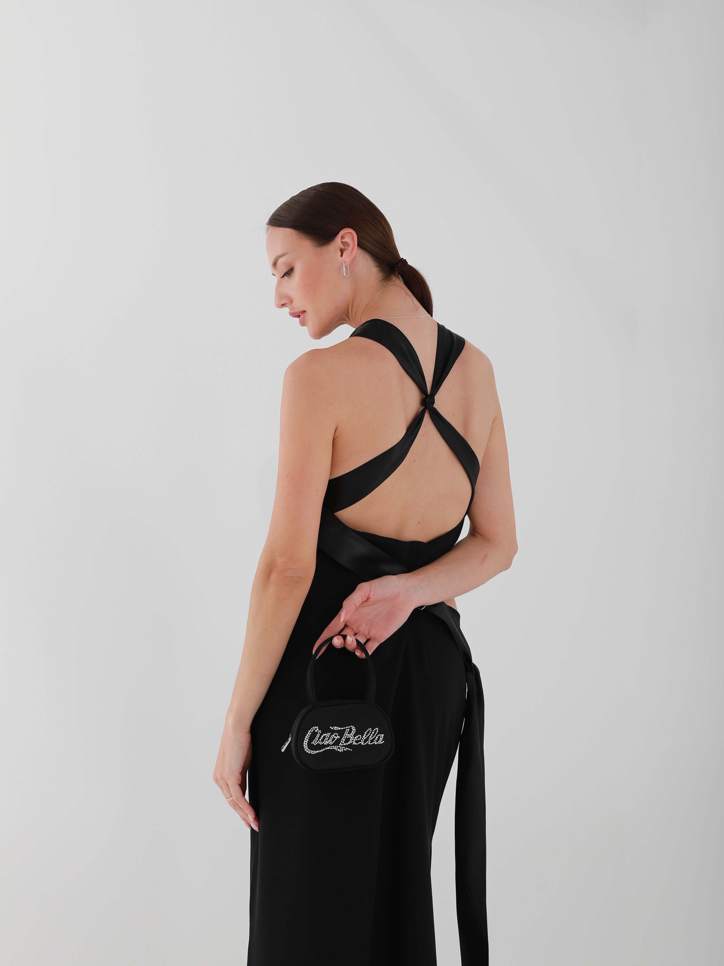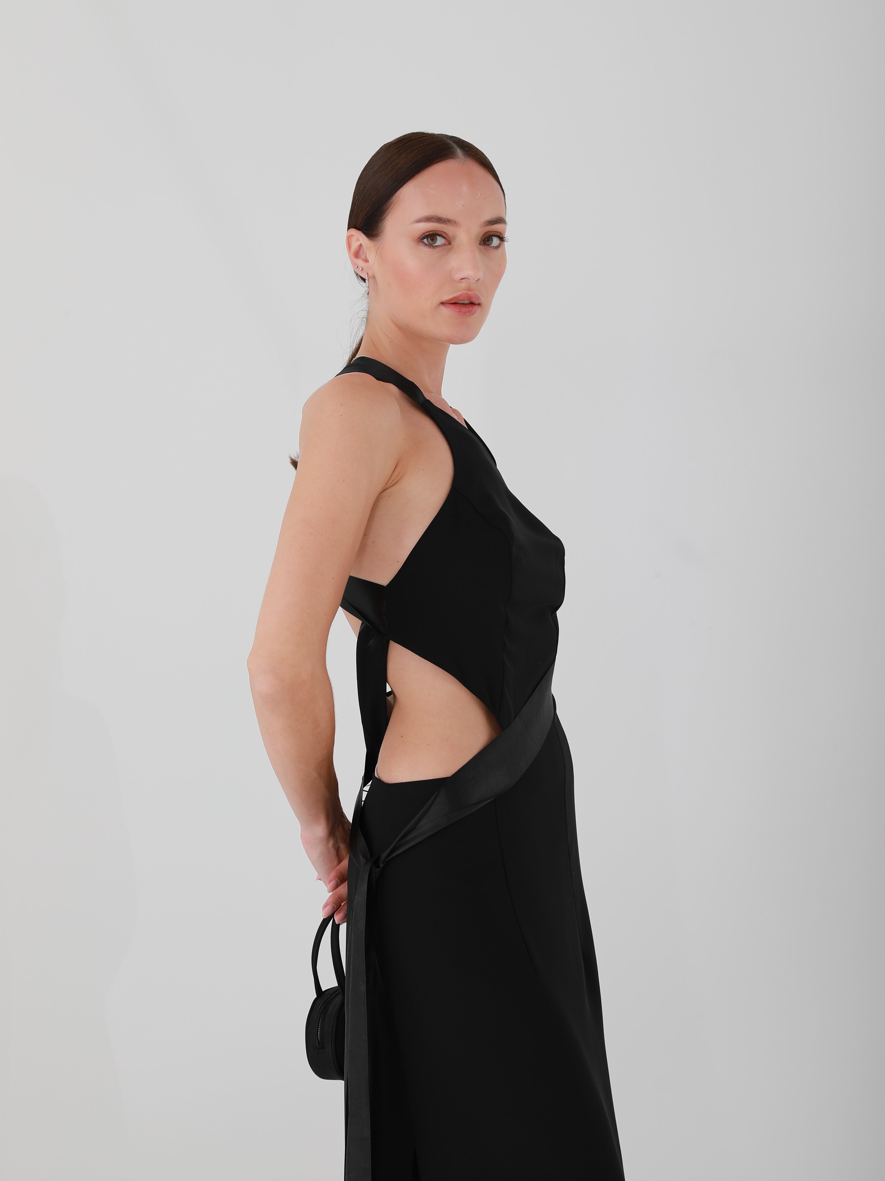 This product is a black long dress made of satin straps. It features an elegant design with a sultry slit and a daring backless style. The stylish cutout adds a unique touch to the overall design. This dress is versatile and can be worn for formal occasions or a night out on the town.