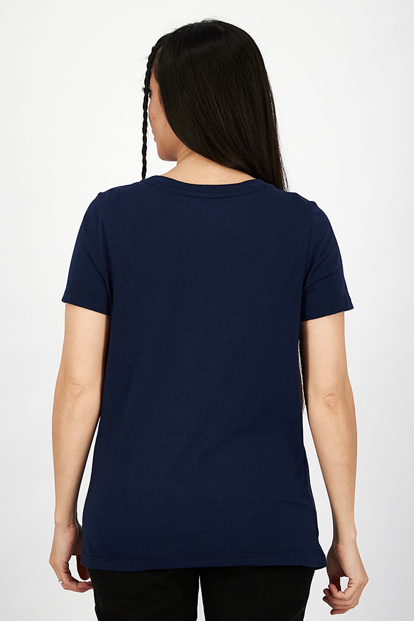 | descriptionOriginal | Bottom Hem : Straight, Care : Machine washable, Fit : Sportswear Fit, Ideal For : Women, Size shown : International, Sleeve Length : Short Sleeve, Thickness : Light, Type of Sport : Training, Types of Neckline & Collar : Round neckline, Types of Sleeve : Short sleeve, Disclaimer : Product color may slightly vary due to photographic lighting sources or your monitor settings., Fabrics : 60% Cotton, 40% Polyester, Pattern & Print : Graphic print, Sportswear Type : T-Shirt, Types of Closures : Pullover, Color Family : Navy Blue, |