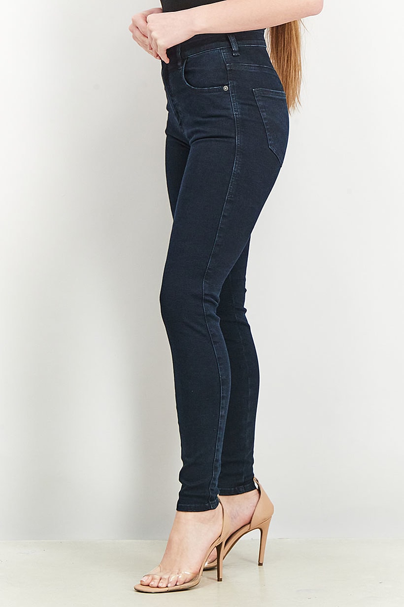 This product is a pair of navy blue skinny jeans designed for women. The jeans have a high rise and a skinny leg style, with a straight bottom hem and belt loops. They are made from a stretchable fabric blend of 90% cotton, 6% polyester, and 4% elastane, and are machine washable. The jeans have a button closure and are ideal for casual occasions. Please note that the product color may vary slightly due to lighting or monitor settings. The size shown is in inches.