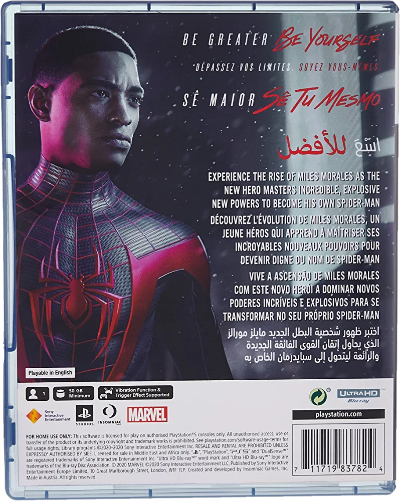 | descriptionOriginal | In the latest adventure in the Marvel’s Spider-Man universe, teenager Miles Morales is adjusting to his new home while following in the footsteps of his mentor, Peter Parker, as a new Spider-Man. But when a fierce power struggle threatens to destroy his new home, the aspiring hero realizes that with great power, there must also come great responsibility. To save all of Marvel’s New York, Miles must take up the mantle of Spider-Man and own it. The rise of Miles Morales Miles Morales discovers explosive powers that set him apart from his mentor, Peter Parker. Master his unique, bio-electric venom blast attacks and covert camouflage power alongside spectacular web-slinging acrobatics, gadgets and skills. A war for power A war for control of Marvel’s New York has broken out between a devious energy corporation and a high-tech criminal army. With his new home at the heart of the battle, Miles must learn the cost of becoming a hero and decide what he must sacrifice for the greater good. A vibrant new home Traverse the snowy streets of his new, vibrant and bustling neighbourhood as Miles searches for a sense of belonging. When the lines blur between his personal and crime-fighting lives, he discovers who he can trust, and what it feels like to truly be home. |