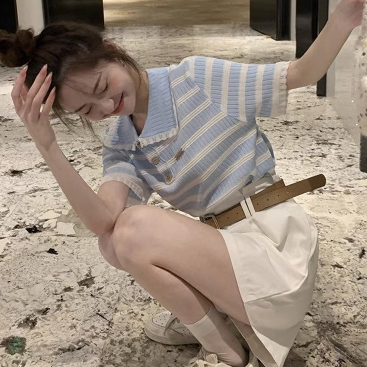 | nameOriginal | Milk Blue Polo Collar Striped Short-sleeved T-shirt Women's Summer Doll Collar Dopamine Sweet Style Wear Colorful Top |