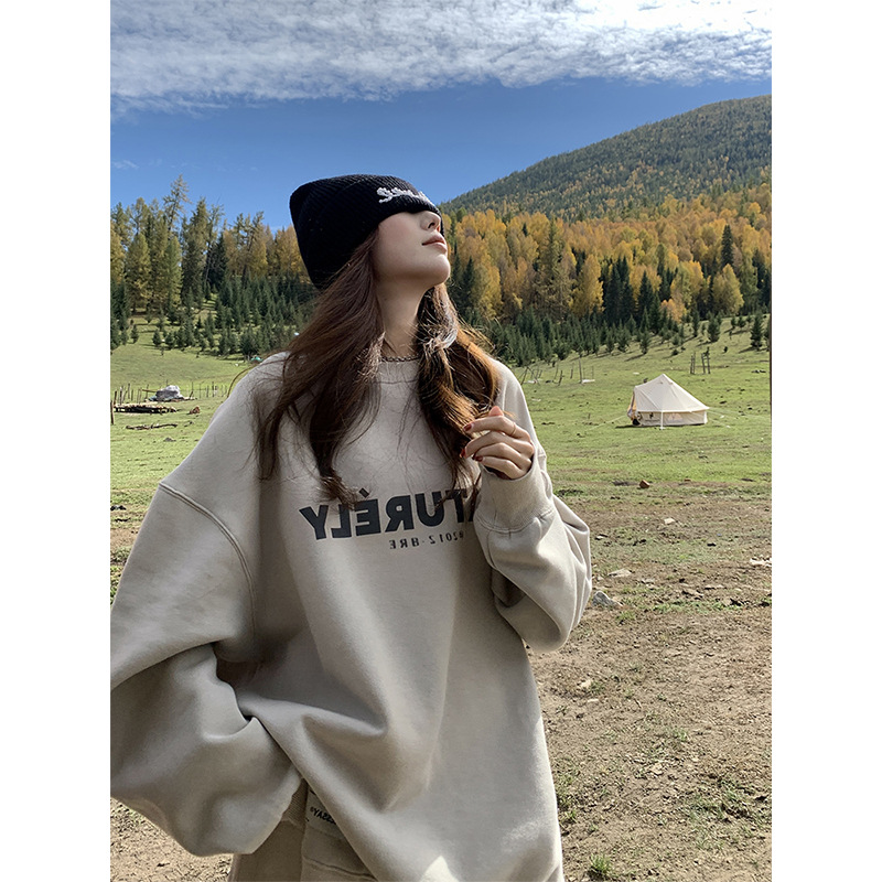 | nameOriginal | Milk Tea American Style Retro Round Neck Sweatshirt Women's Lazy Loose Mid-length oversize Large Size Top for Spring and Autumn |