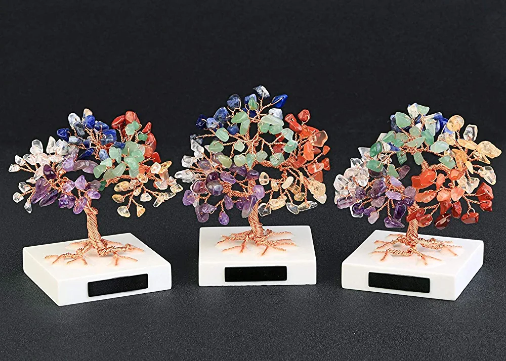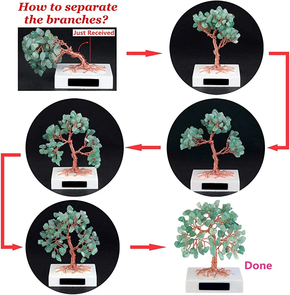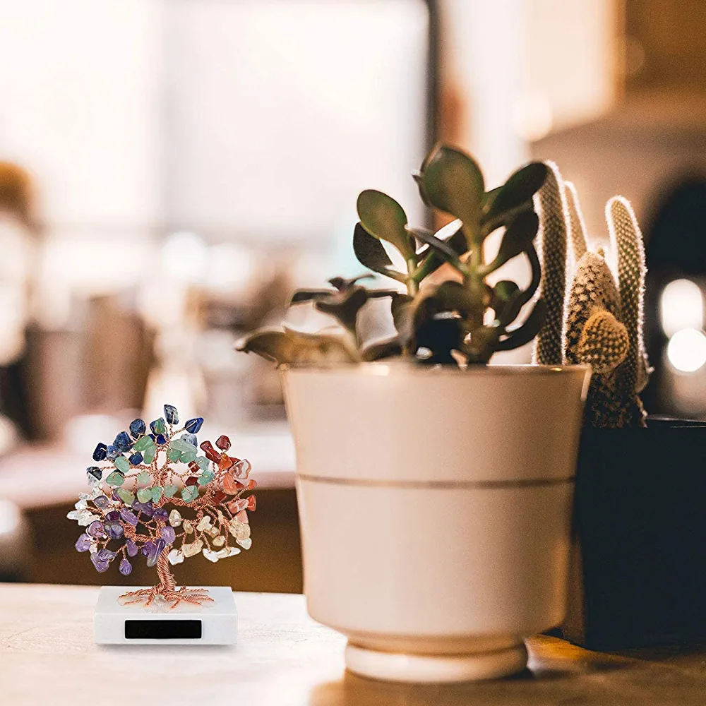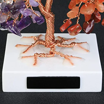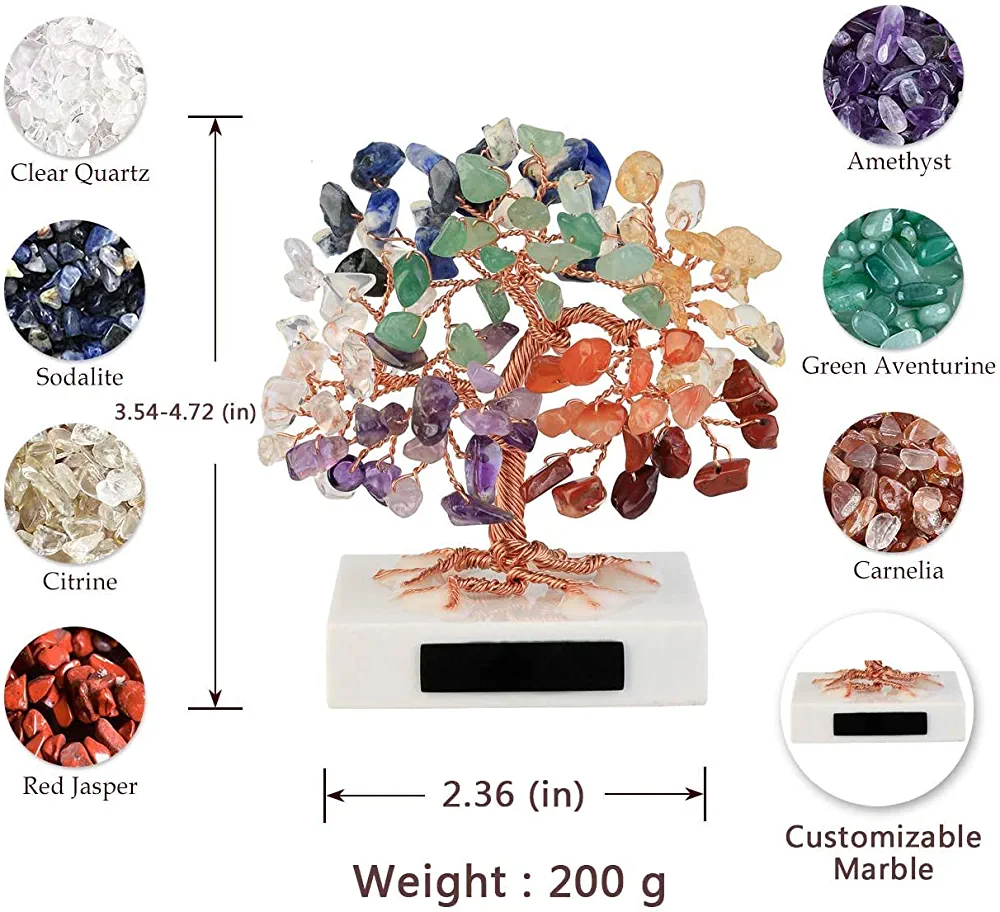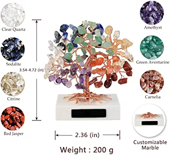 SYOSI Handmade Gemstones Chakra Healing Crystals Money Tree for Home Office Desk Decoration,Living Room & Bedroom Decor Bonsai Money tree Ornaments are made of natural Tumbled gemstones,The base is made of marble. Marble base with a copper wire wrapped money tree sculpture with crystal quartz leaves, secured to and growing out of the crystal, hand-twisted. We will fold up all branches and pack secured while packing. Leaves and branches can be arranged how you like. The best place to put the item is your living room and the table of your office. 7 Chakras are energy centers in our body in which energy flows through in balance with each other. An unbalanced energy field may cause a blockage in the flow of energy. Different colors are related to each chakra, and therefore you can adapt stones to the chakra according to the color of the crystal. THE TREE OF LIFE-is associated with knowledge and wisdom.A simple Tree of Life fengshui decor can keep you inspired and encouraged,help you find strength and stability.The Tree of Life with its seeds,branches and roots signifies the family tree.It will Infuse Abundance and Prosperity into Your Life.When you wear it,it promotes beauty, health,good luck,and healing. Bedroom Living Room Office Decoration Personalize your crystal tree The front of this crystal money tree marble base can add text, you can engrave your message or wishes on the stand to express your love and blessings to your lover, best friend and family. You can engrave your name, special date, motivational sentences and blessings on the stand, it will be a unique and meaningful gift. Great gift for elders, family, best friend, business partner or lover for birthdays, anniversaries, weddings, anniversaries, Valentine's Day, Mother's Day, Christmas and more! Note: Adding text requires you to do it yourself after receiving the goods What you can get from this Crystal Money Tree? Bring wealth, prosperity,opportunity and good luck to you.