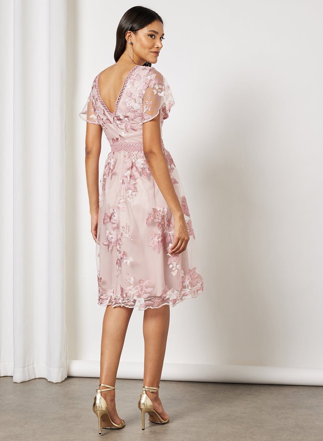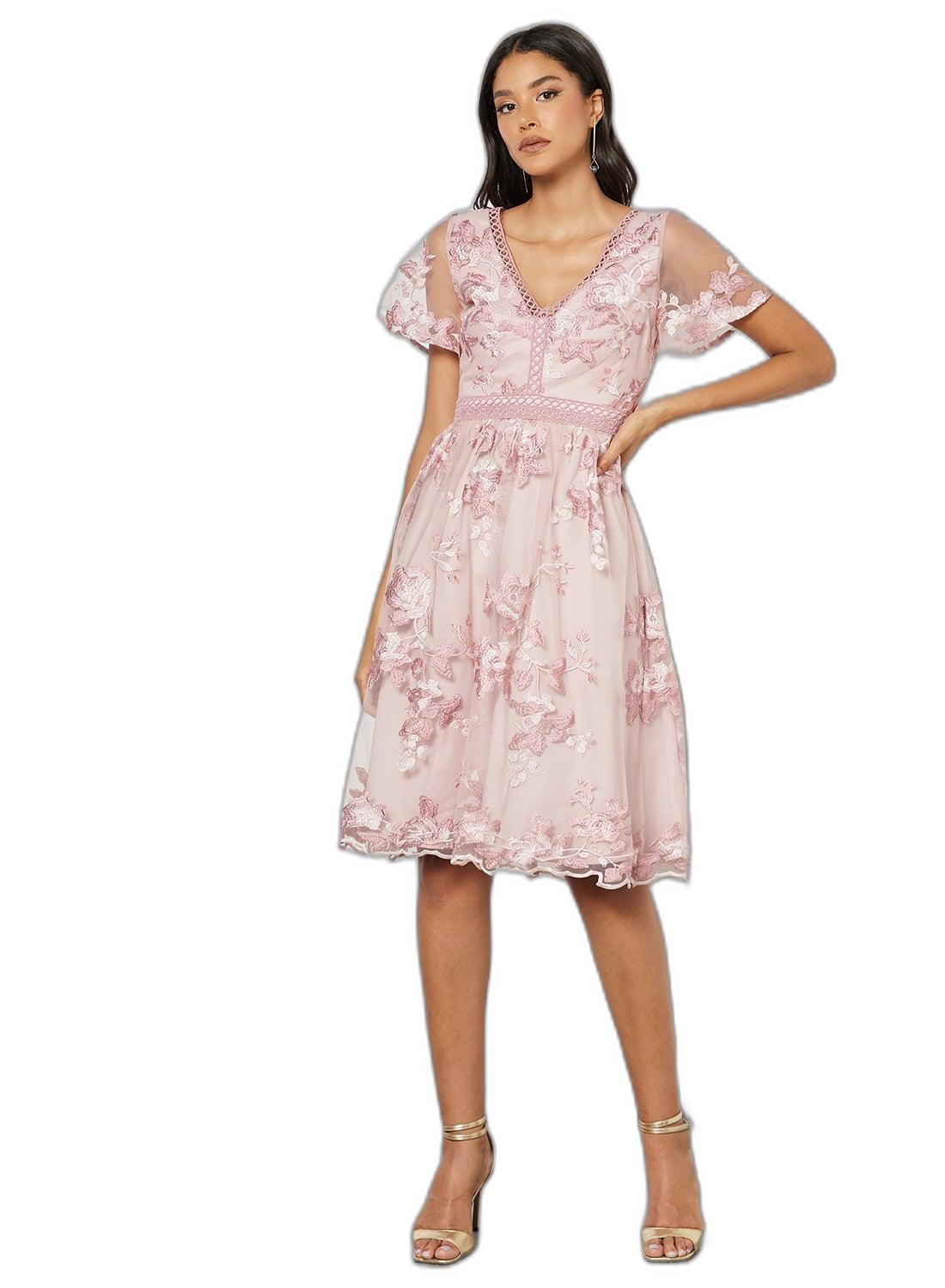 To achieve a party-ready appearance, complement this dress with a pair of heels and a clutch. It features a V-neckline, short sleeves, and an embroidered overlay. The back zip closure is concealed, and the dress falls to a midi length. The shell is made of 100% polyester, and it should be washed according to the care label instructions.