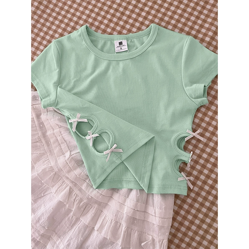 | nameOriginal | Mint green hollow short sleeves with chic tight bow |