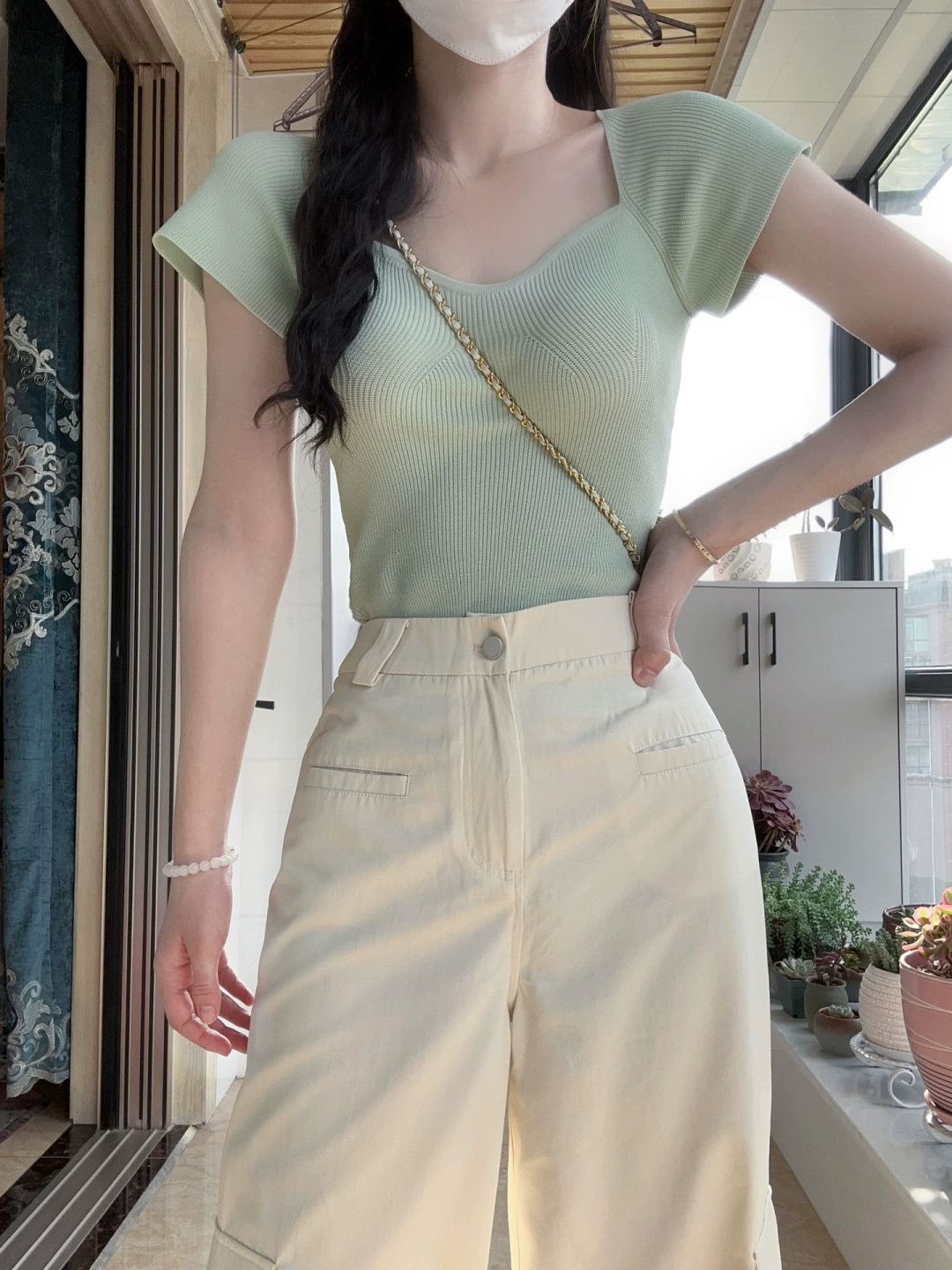 | nameOriginal | Mint Green Square Neck Pure Desire Slim Short Sleeve Sweater |
