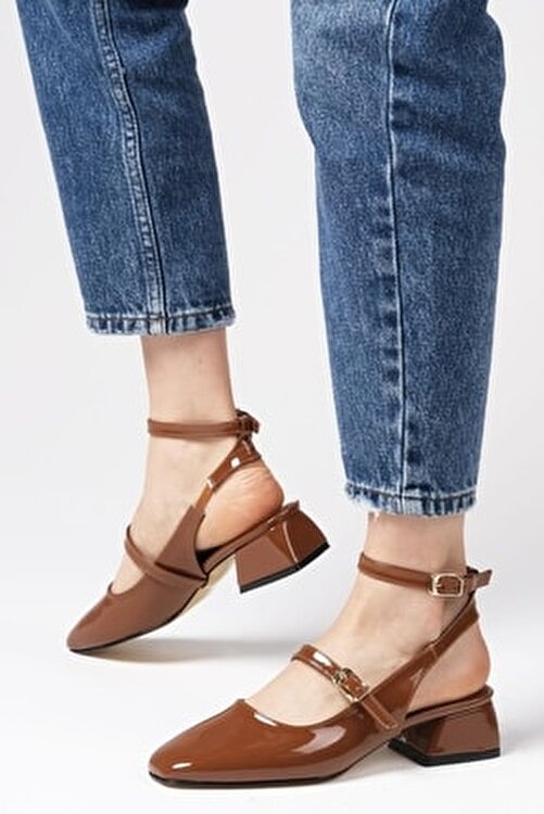 Tobacco patent leather, open back short heels