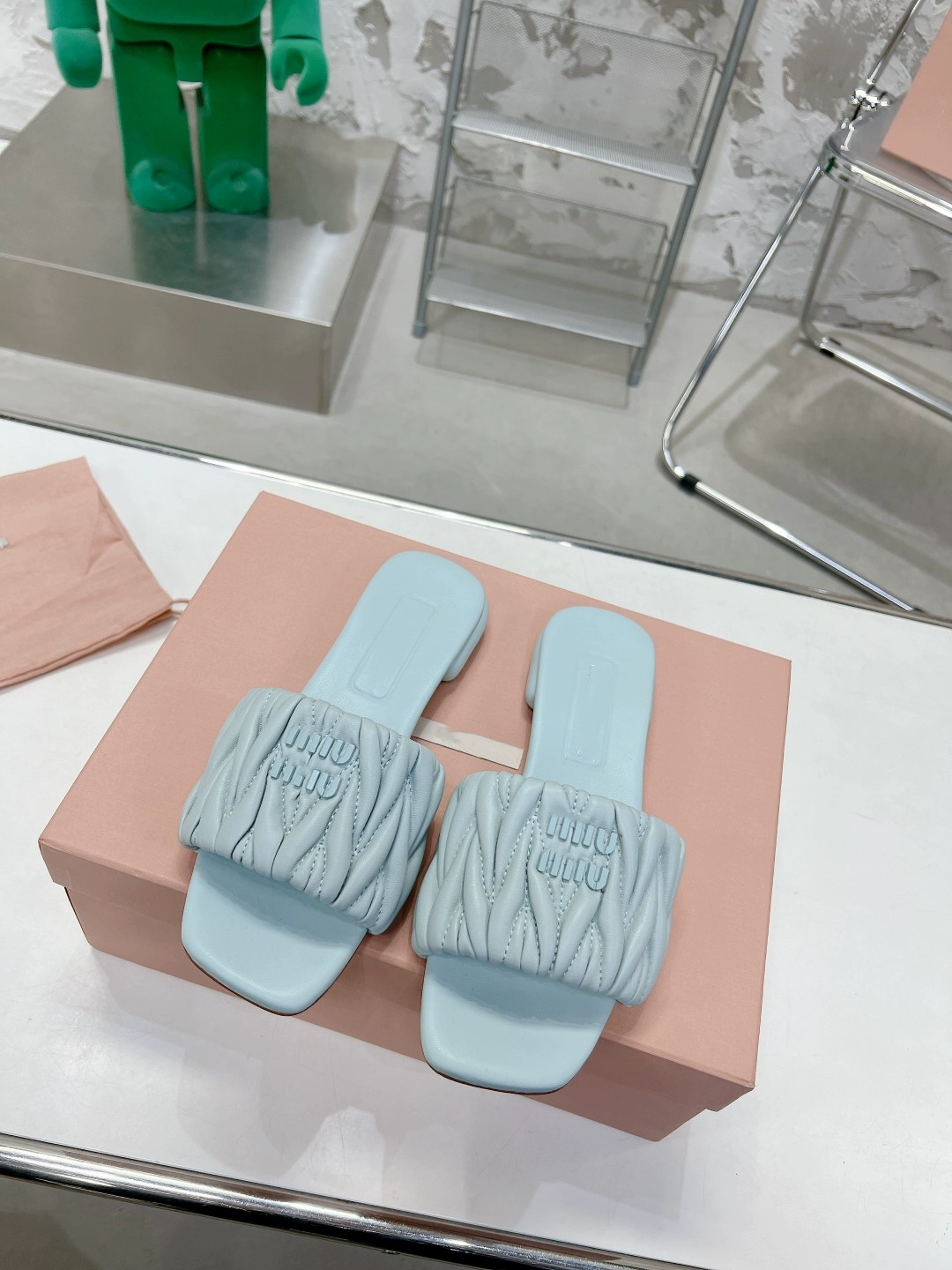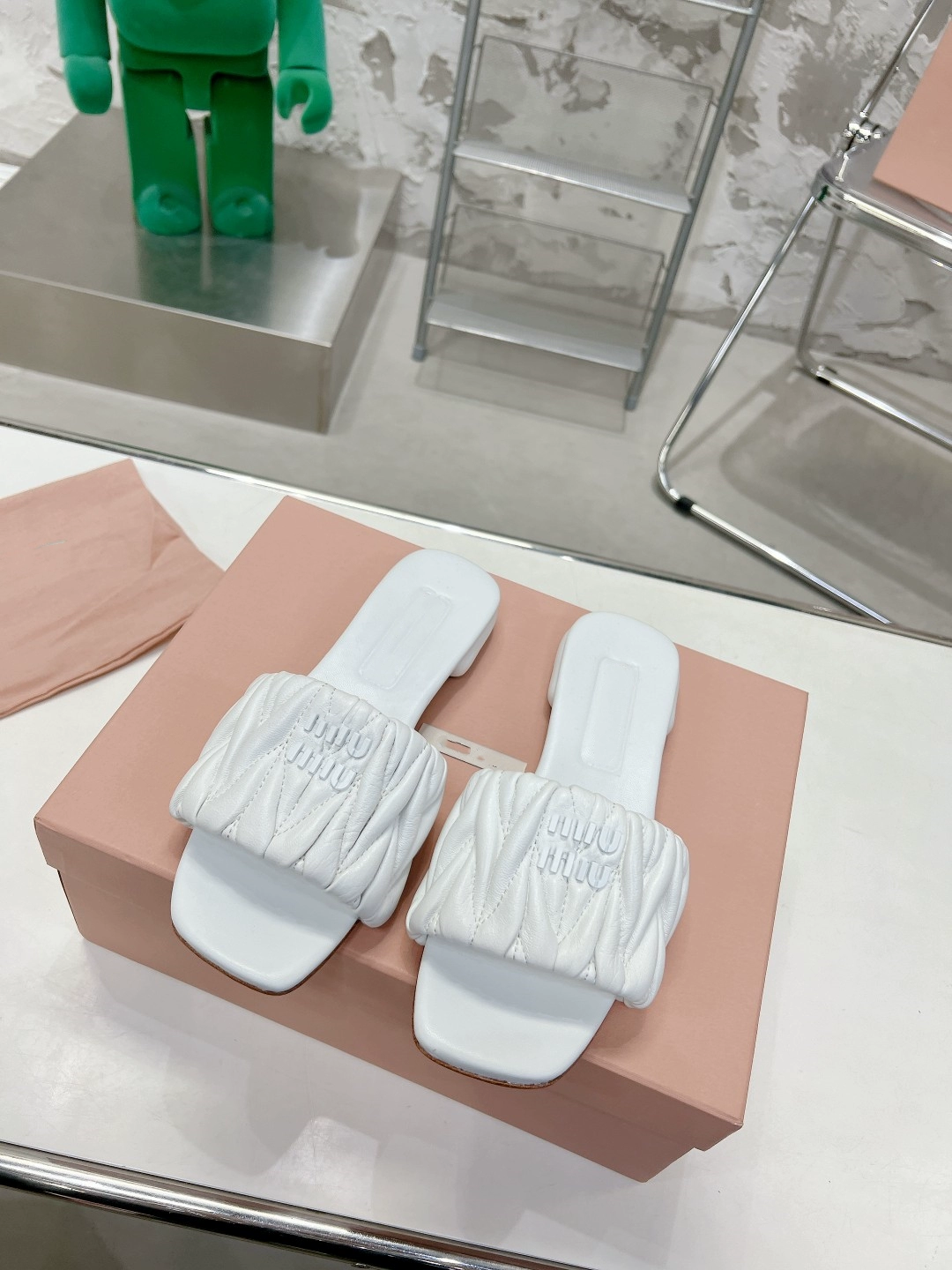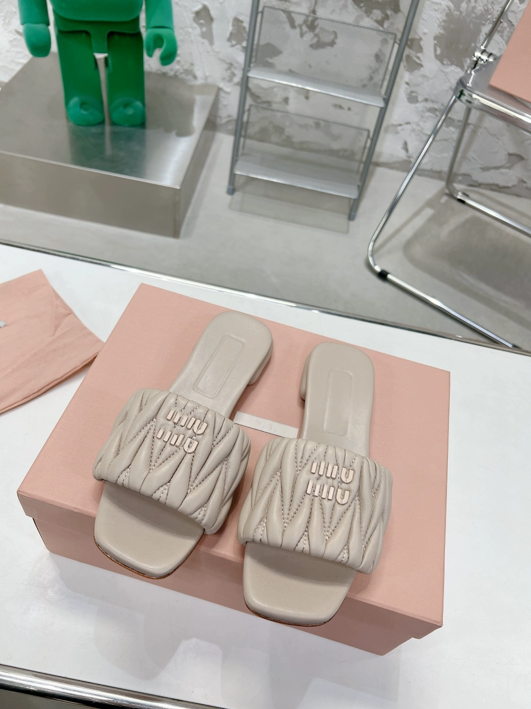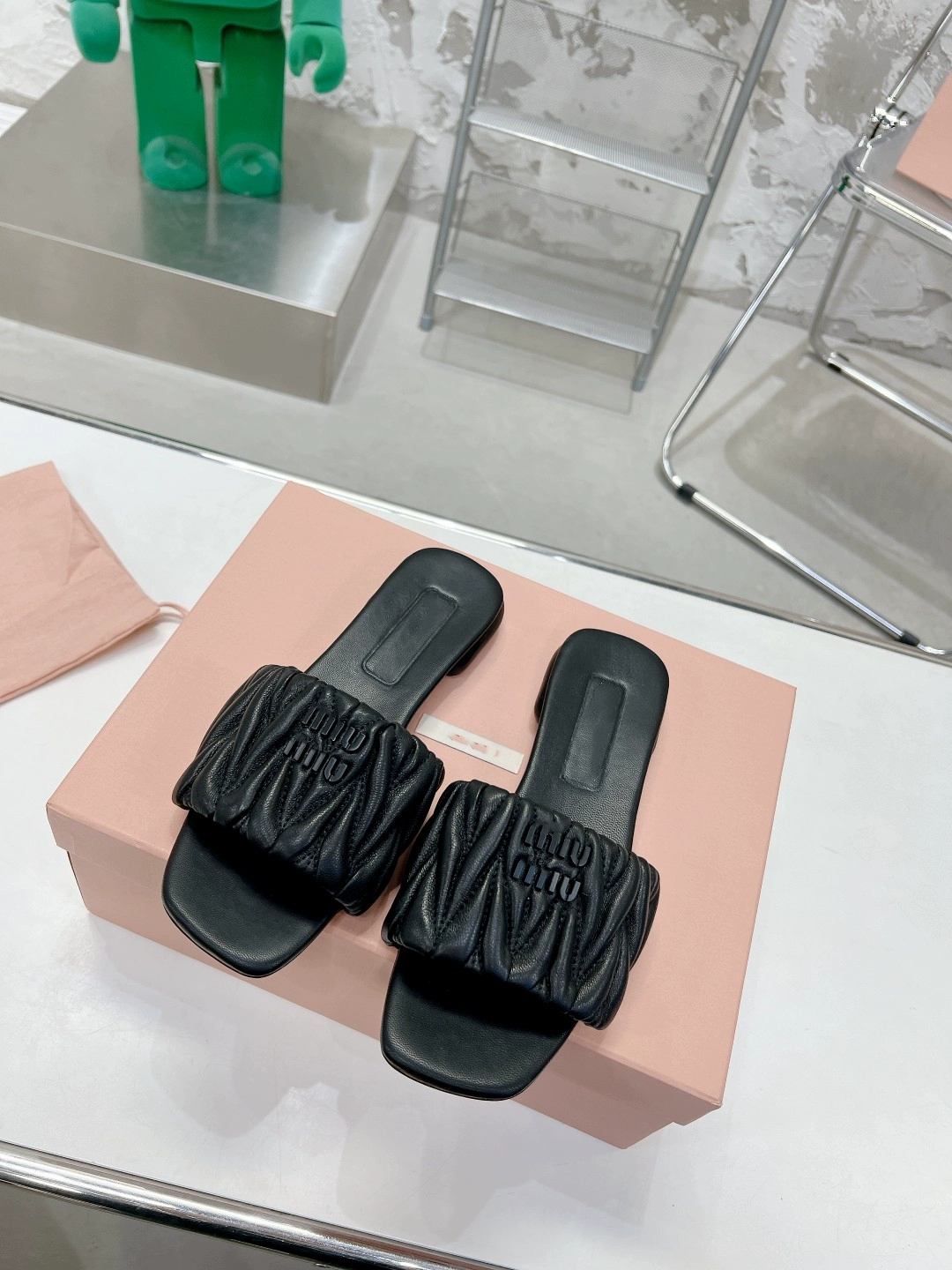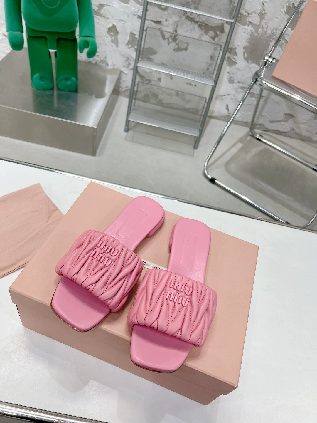 miu genuine leather pleated outer flat slippers, high-end version, comfortable and fashionable fairy style casual slippers
