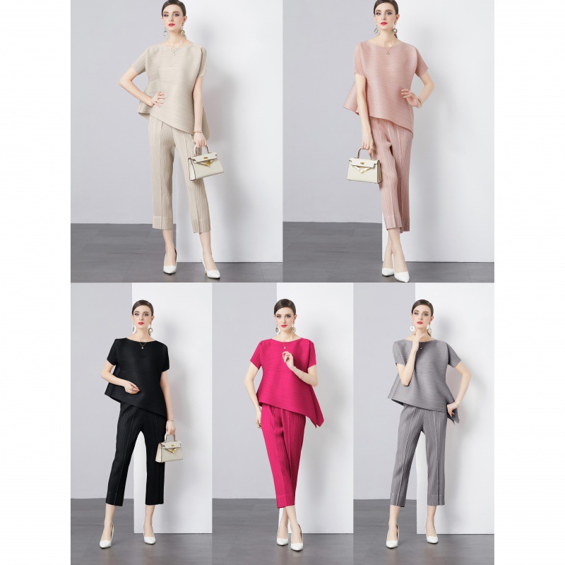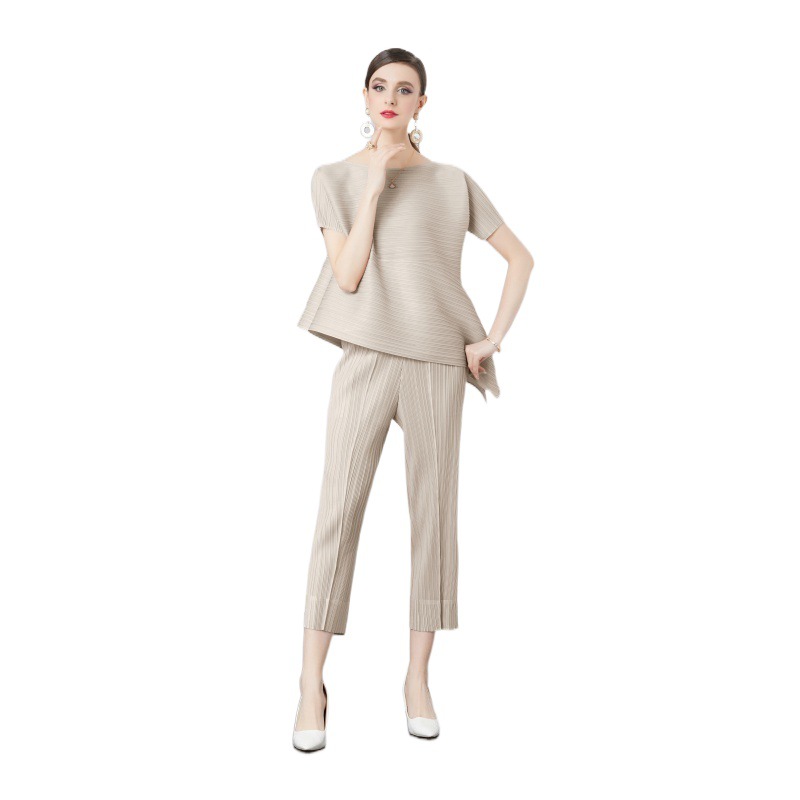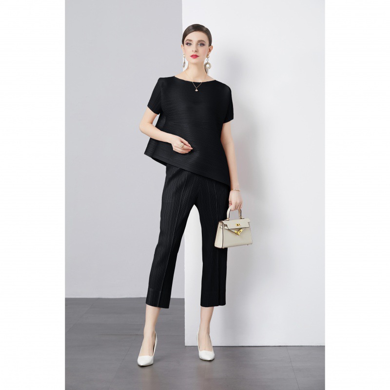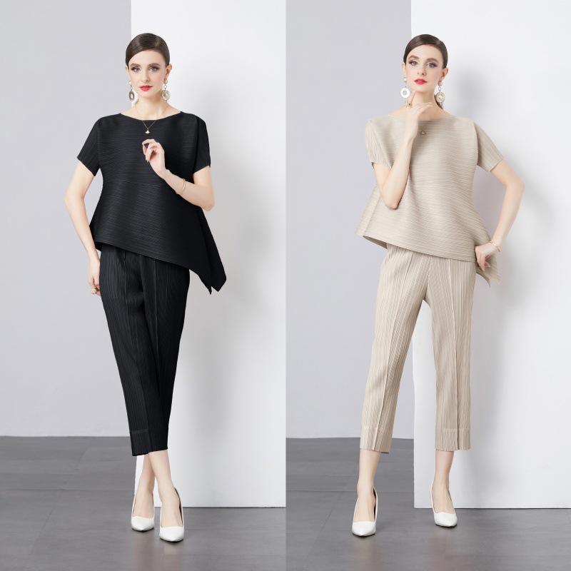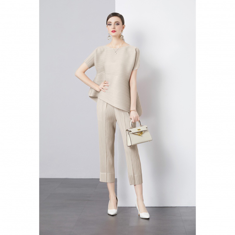 | nameOriginal | Miyake Pleated Irregular Design Crewneck Simple Stitching Top Cropped Pants Solid Color Summer Drape Suit |