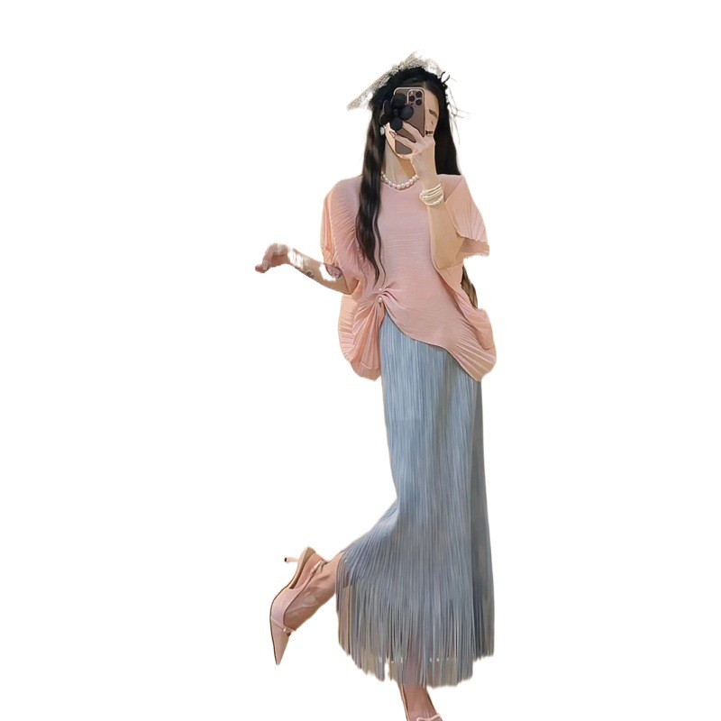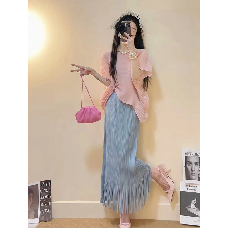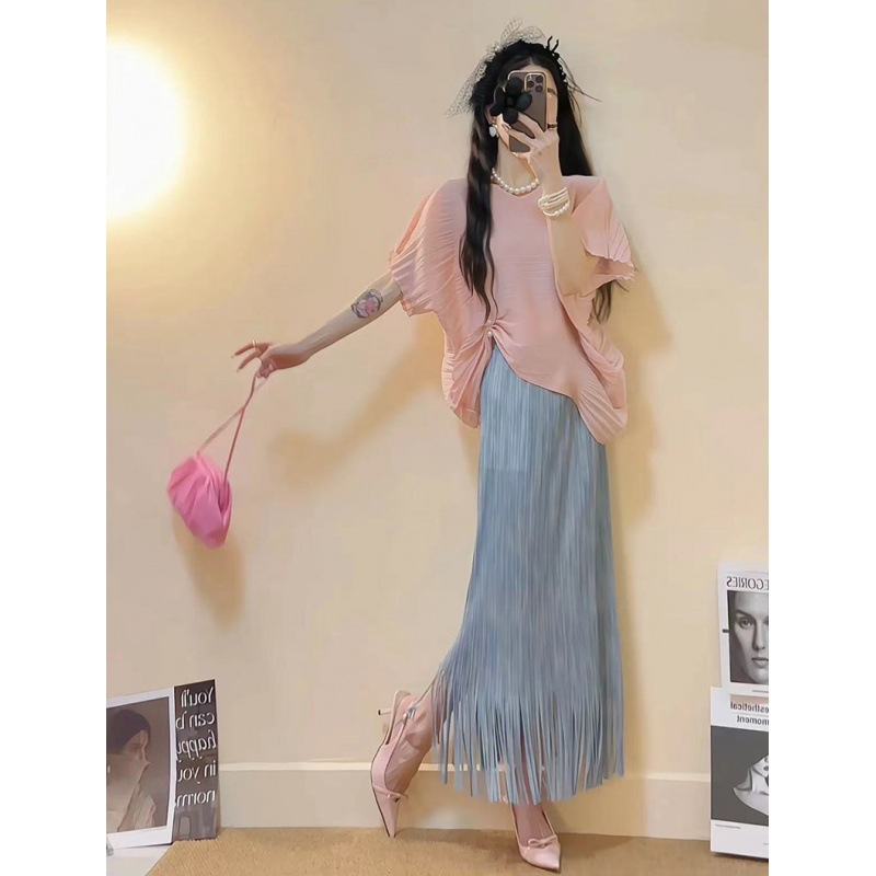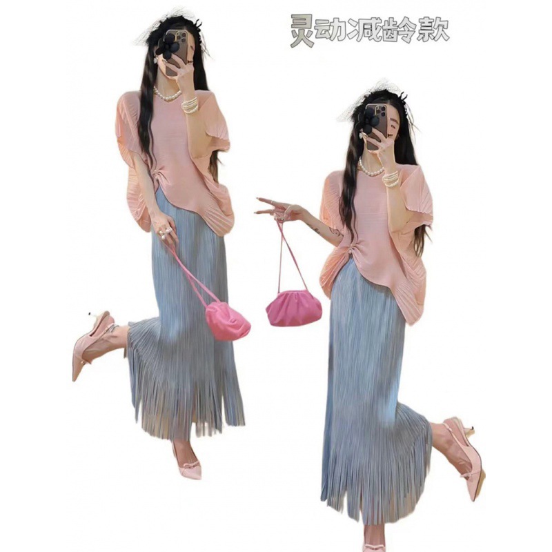 | nameOriginal | Miyake pleated pink top smart age-reducing light blue single-layer tassel overskirt two-piece women's spring and summer |