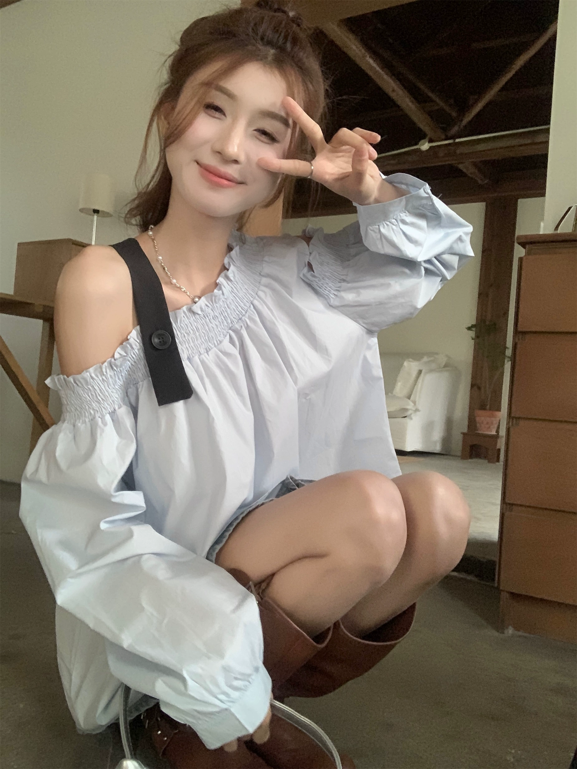 mm fat girl off-shoulder sexy contrasting long-sleeved shirt