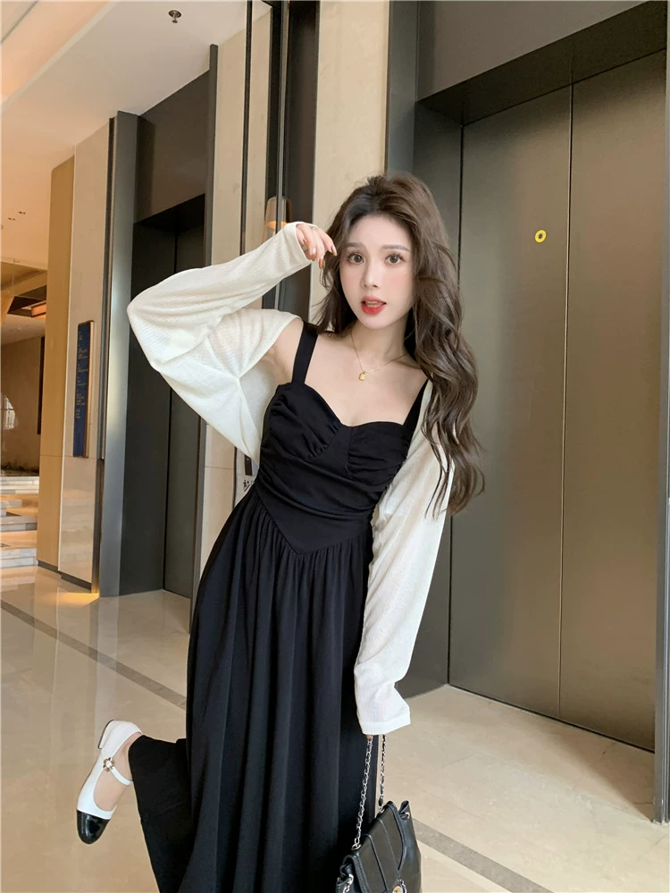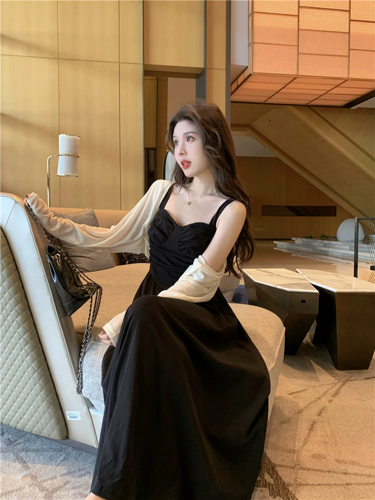 mm French Hepburn style black shawl suspender dress