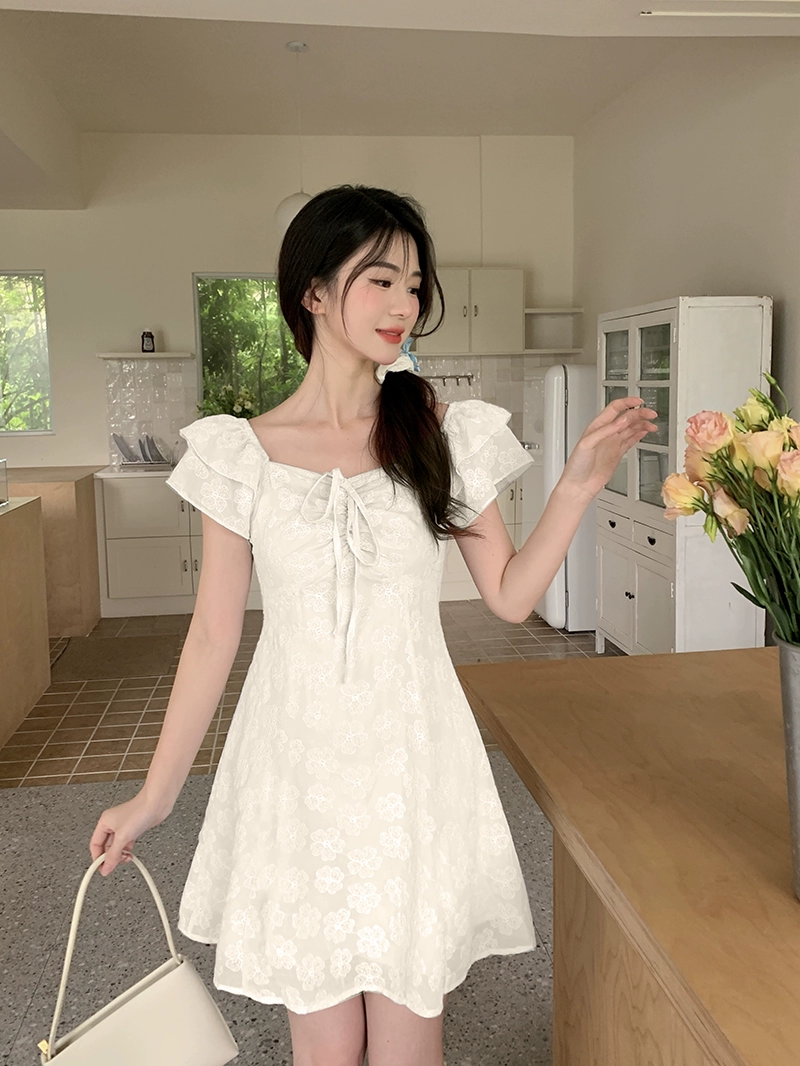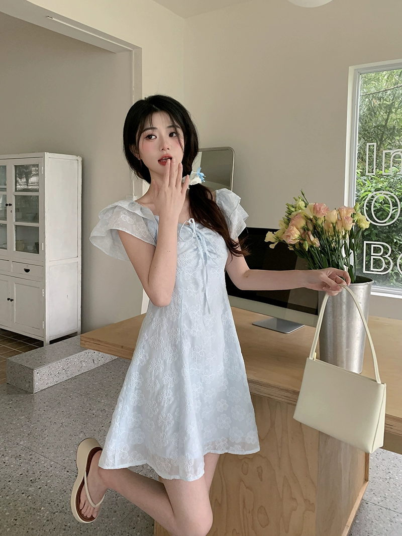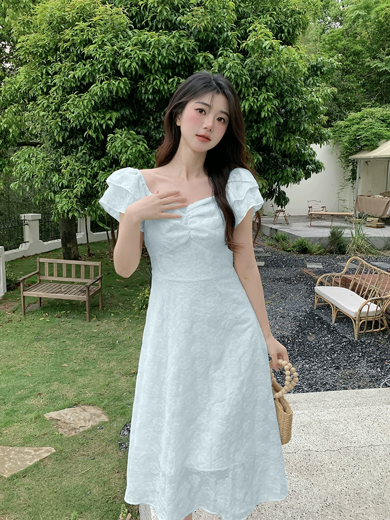 MM summer slightly fat one-line collar over-the-knee short-sleeved dress
