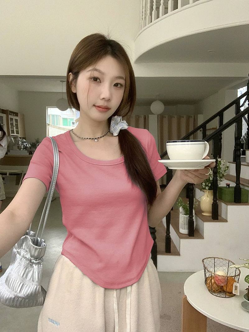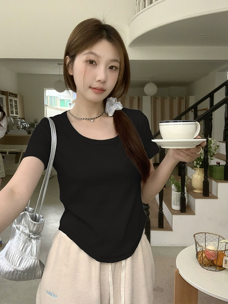 MM summer waist-cinching, right-shoulder design short-sleeved T-shirt