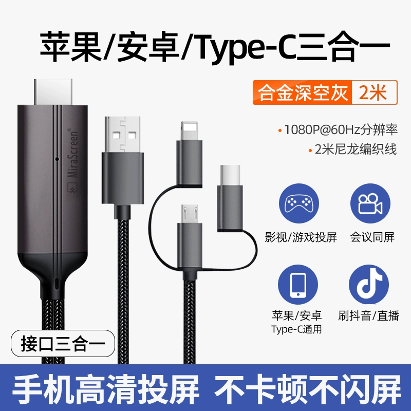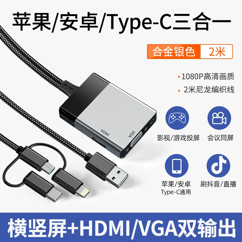| nameOriginal | Mobile phone connected to TV screen projection cable HD wired same-screen device typec to hdmi computer display projector converter adapter three-in-one suitable for Apple Android Huawei vivo |
