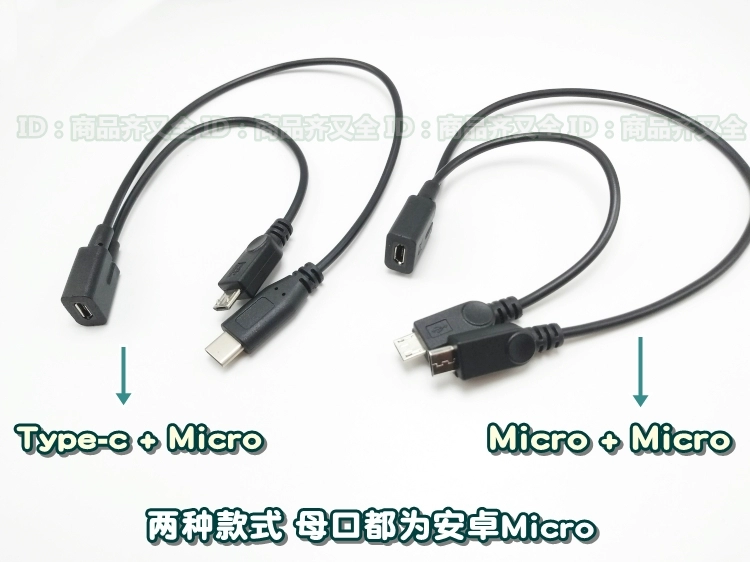 Mobile phone data cable divided into two, two male plugs, charging cable, Micro female to Type-c, one to two male plugs