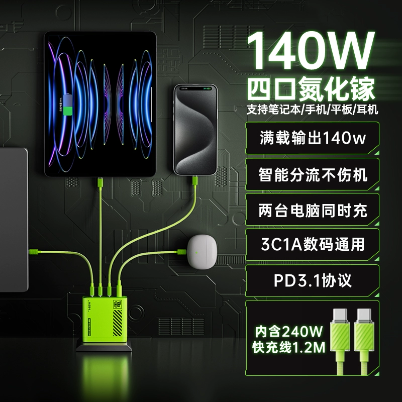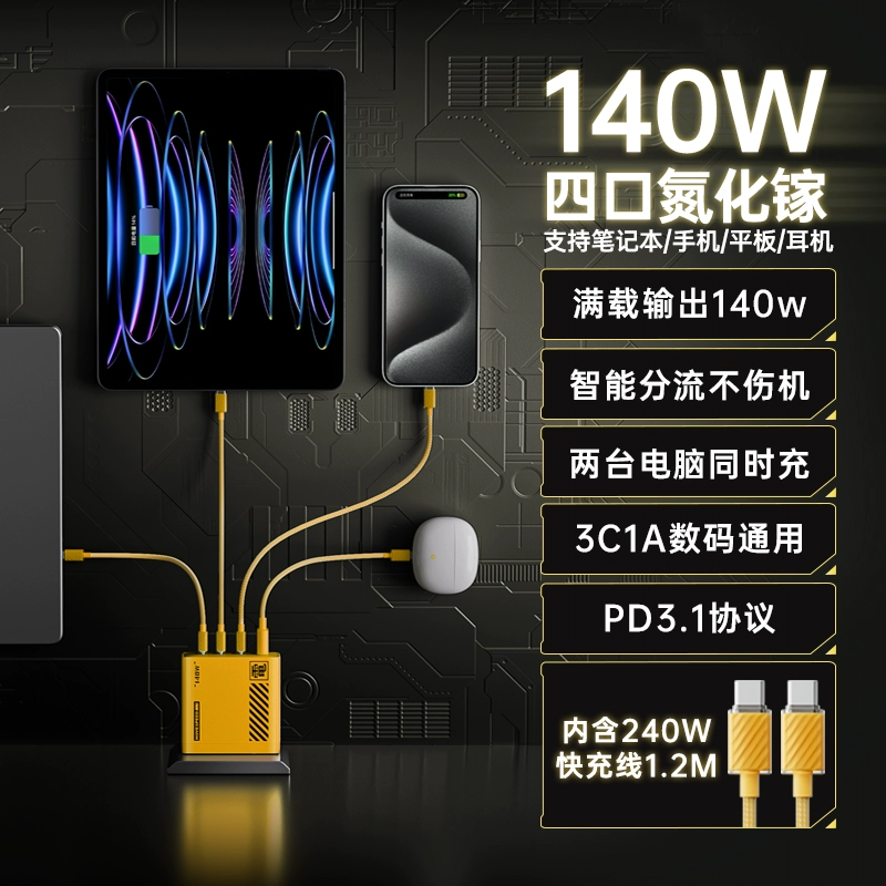 | nameOriginal | Mobile speed 140W gallium nitride GaN charger head PD3.1 super fast charging typec plug multi-port USB suitable for Apple 15promax Huawei 14 laptop 100w desktop charging station |
