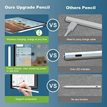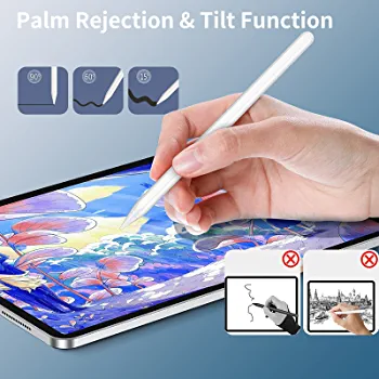 This product is a wireless charging stylus that comes with a charging stand, replaceable pen nib, tilt function, and palm rejection. It is compatible with wireless charging models and can be connected easily. You can also add a power display to it.