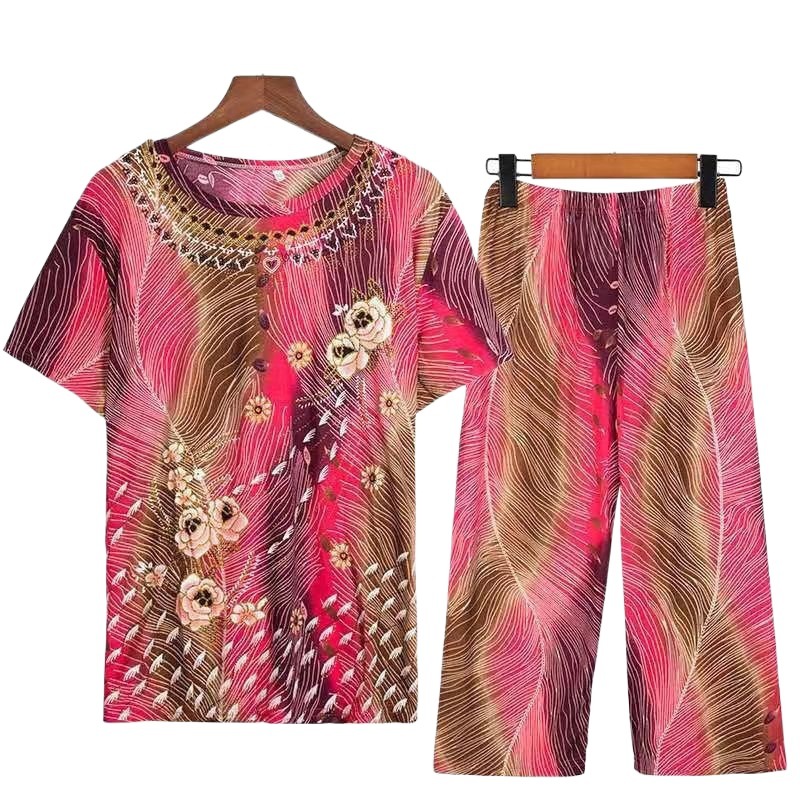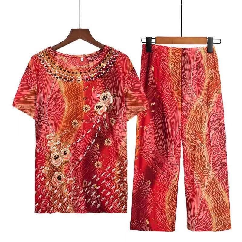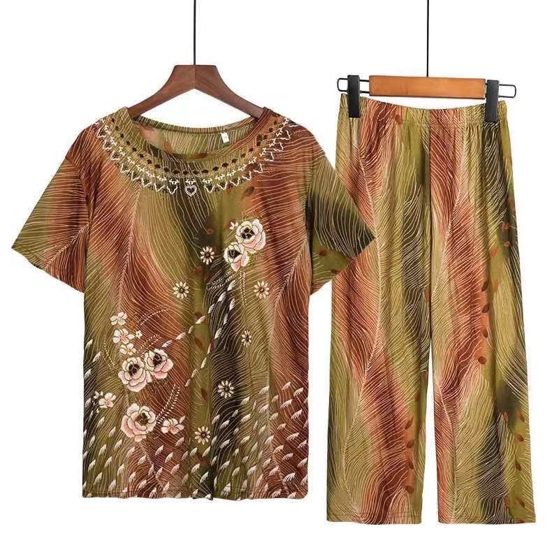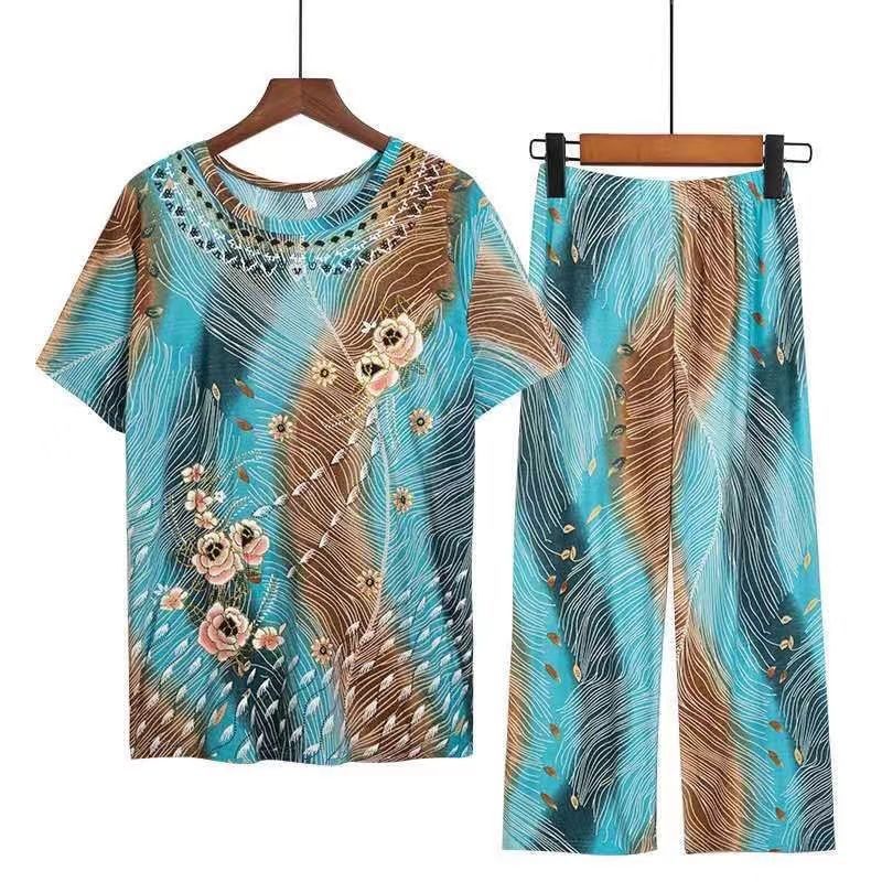 | nameOriginal | Mom Suit Summer 2024 60-70 Year Old Grandma Imitation Ice Silk Home Suit Two-Piece Large Size Top Pants |