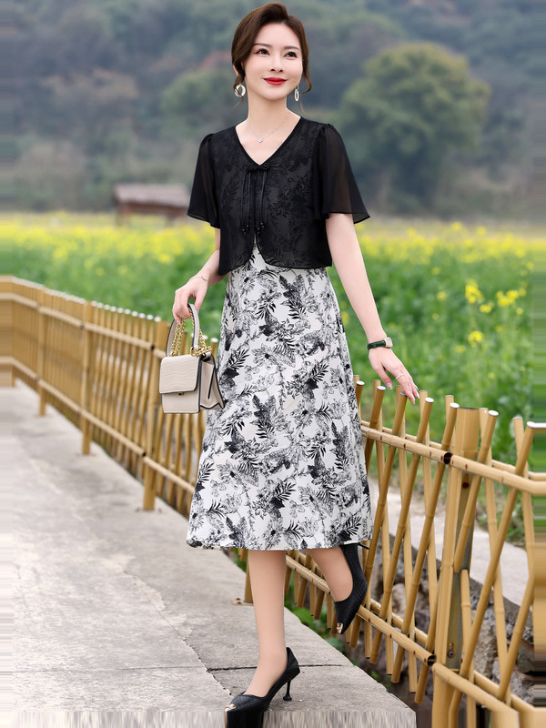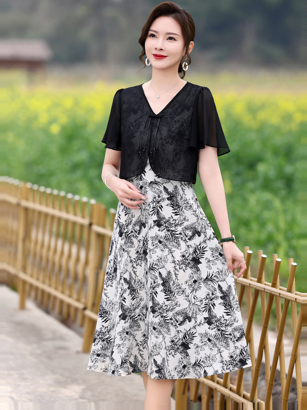| nameOriginal | Mom Summer Dress Elegant Short-sleeved dress 2024 New Style Western Style Middle-aged Women's Belly Covering Slimming Chiffon Skirt |