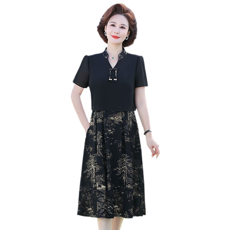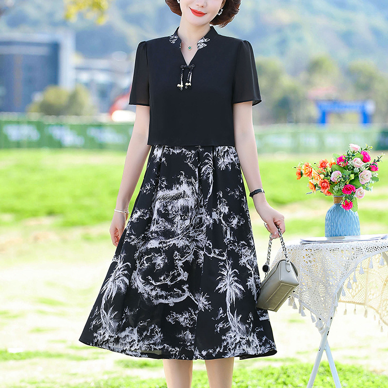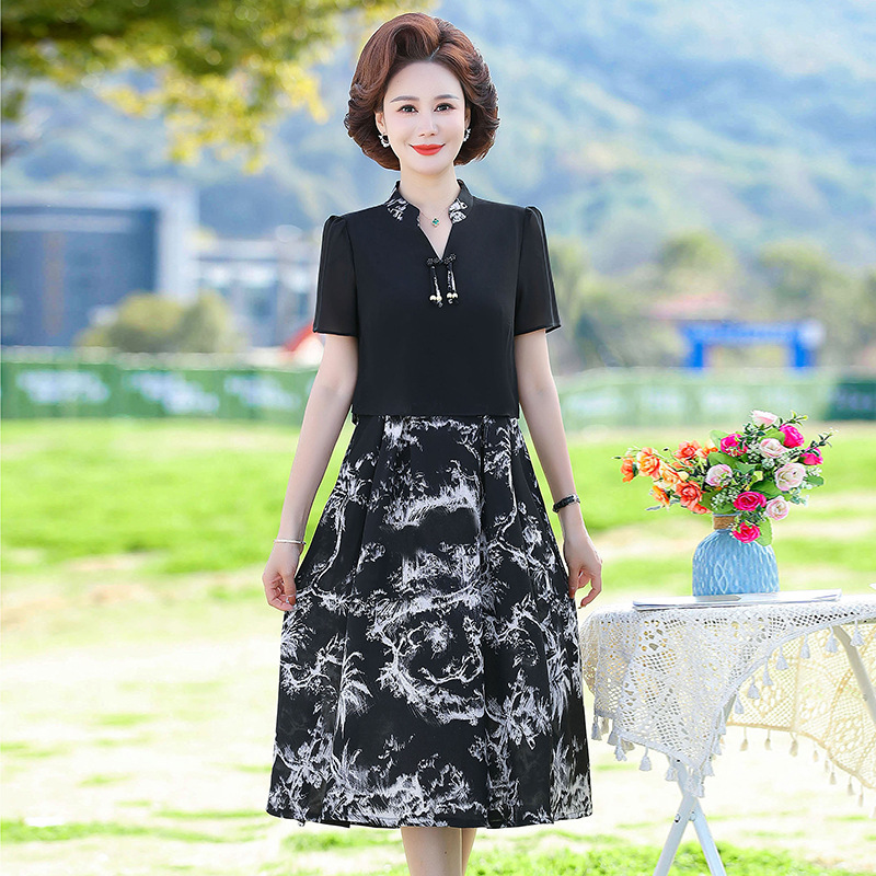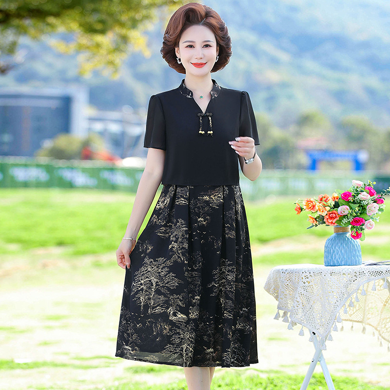 | nameOriginal | Mom summer new national style chiffon fake two-piece skirt 2024 new middle-aged and elderly women's dress plus size women's clothing |