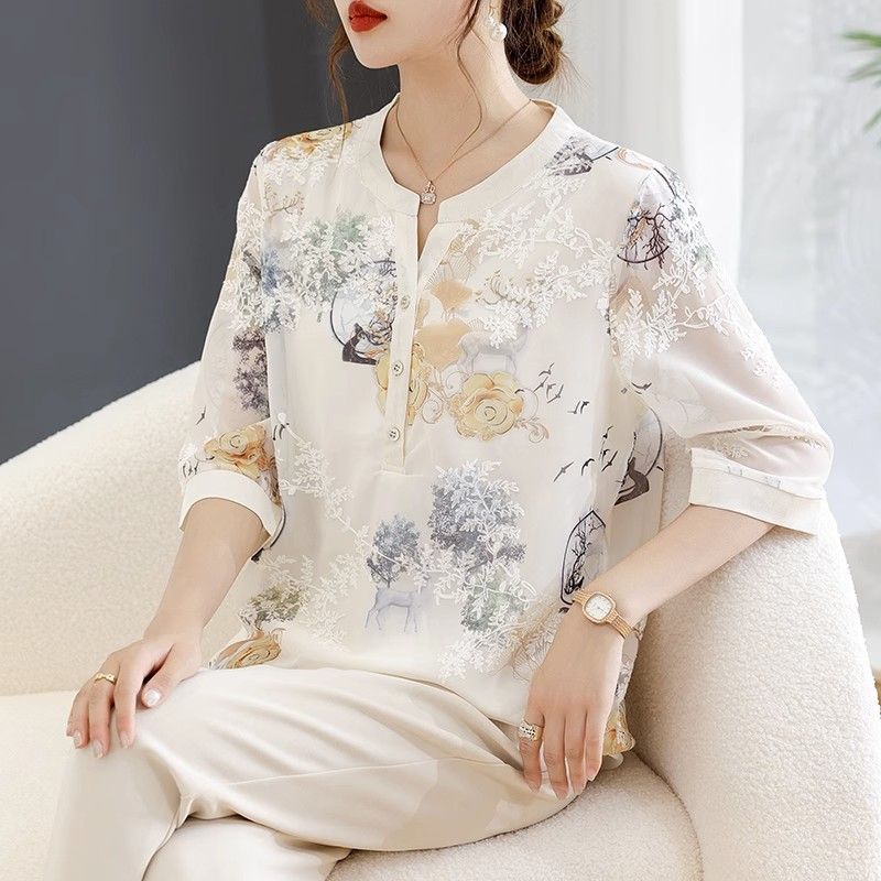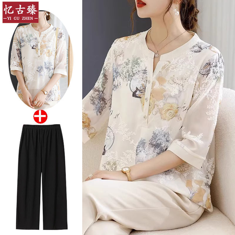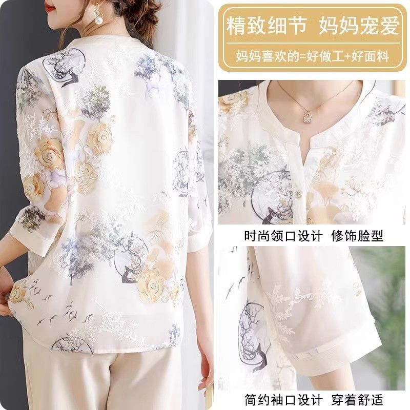 Mom Summer Short-sleeved Suit Chiffon Small Shirt Fashion Embroidered Shirt Noble Middle-aged and Elderly Women's Summer Clothes