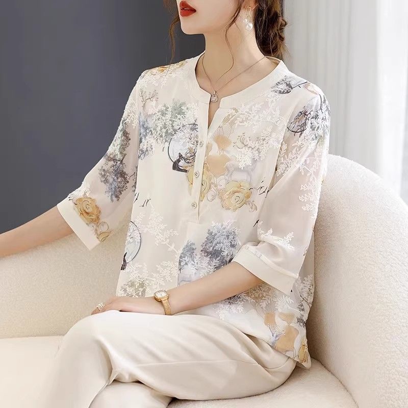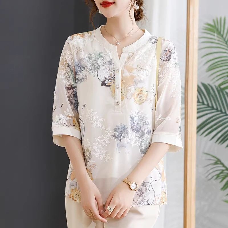 Mom Summer Short-sleeved Suit Chiffon Small Shirt Fashion Embroidered Shirt Noble Middle-aged and Elderly Women’s Summer Clothes