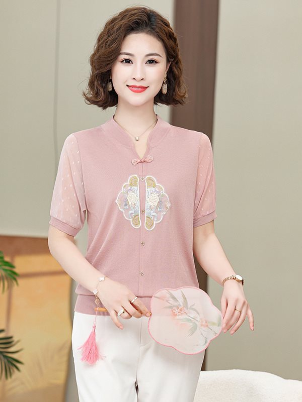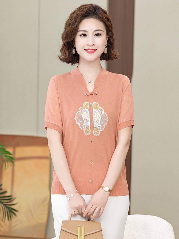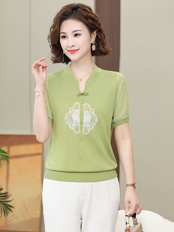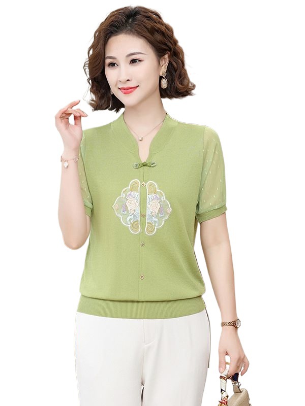 | nameOriginal | Mom's Summer Dress Retro New Chinese Knitted Ice Silk Top with Buckle for Summer Fashion Embroidered National Style Short-sleeved T-shirt |