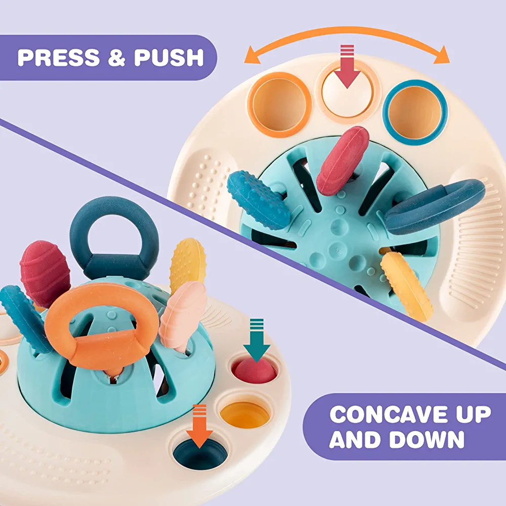 Montessori-inspired silicone toy for babies aged 6-18 months, designed to develop fine motor skills and provide multi-sensory stimulation. Perfect as a travel toy or birthday gift for toddlers.