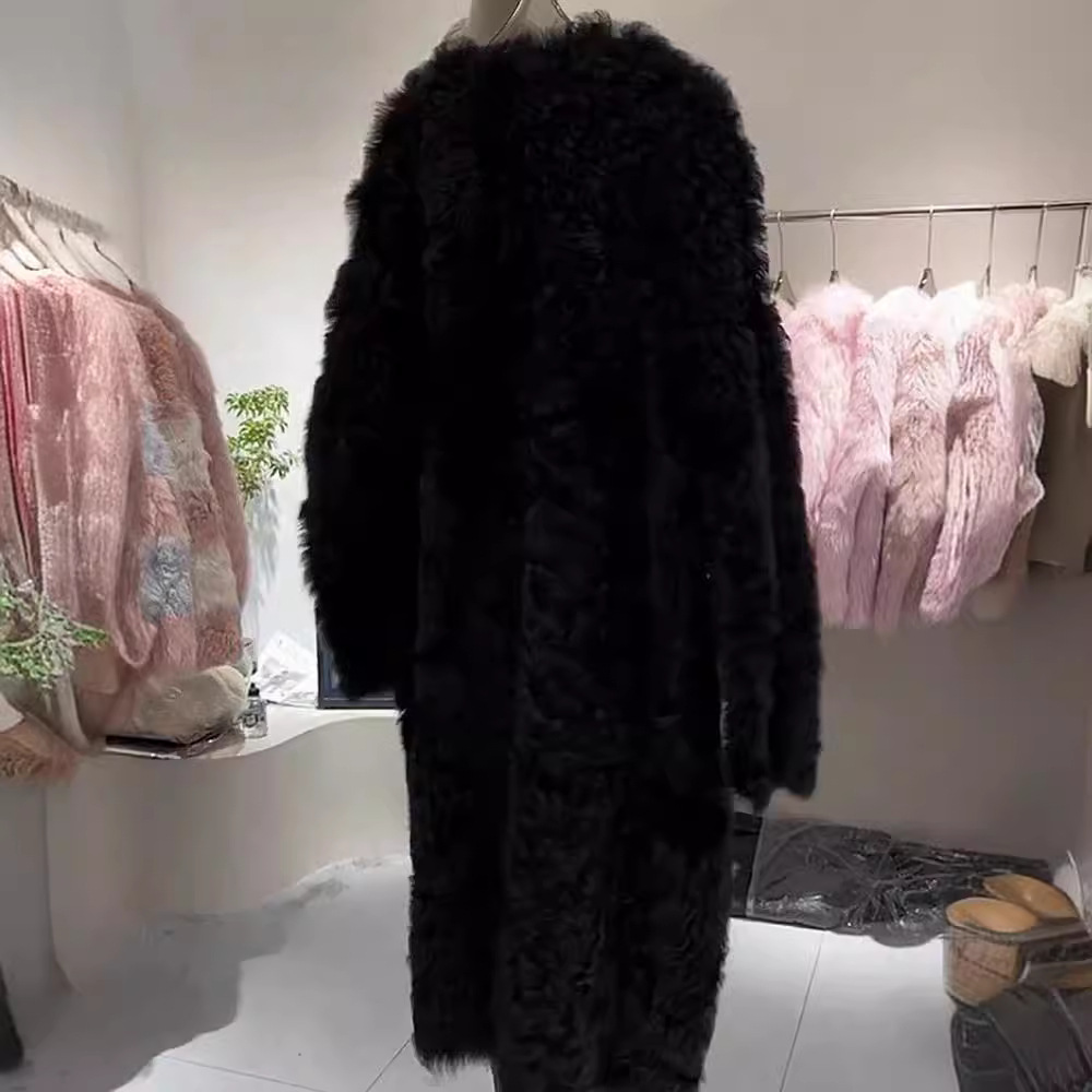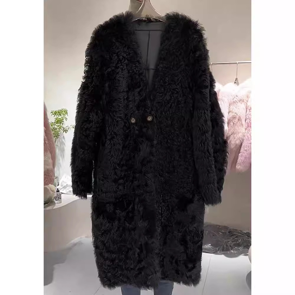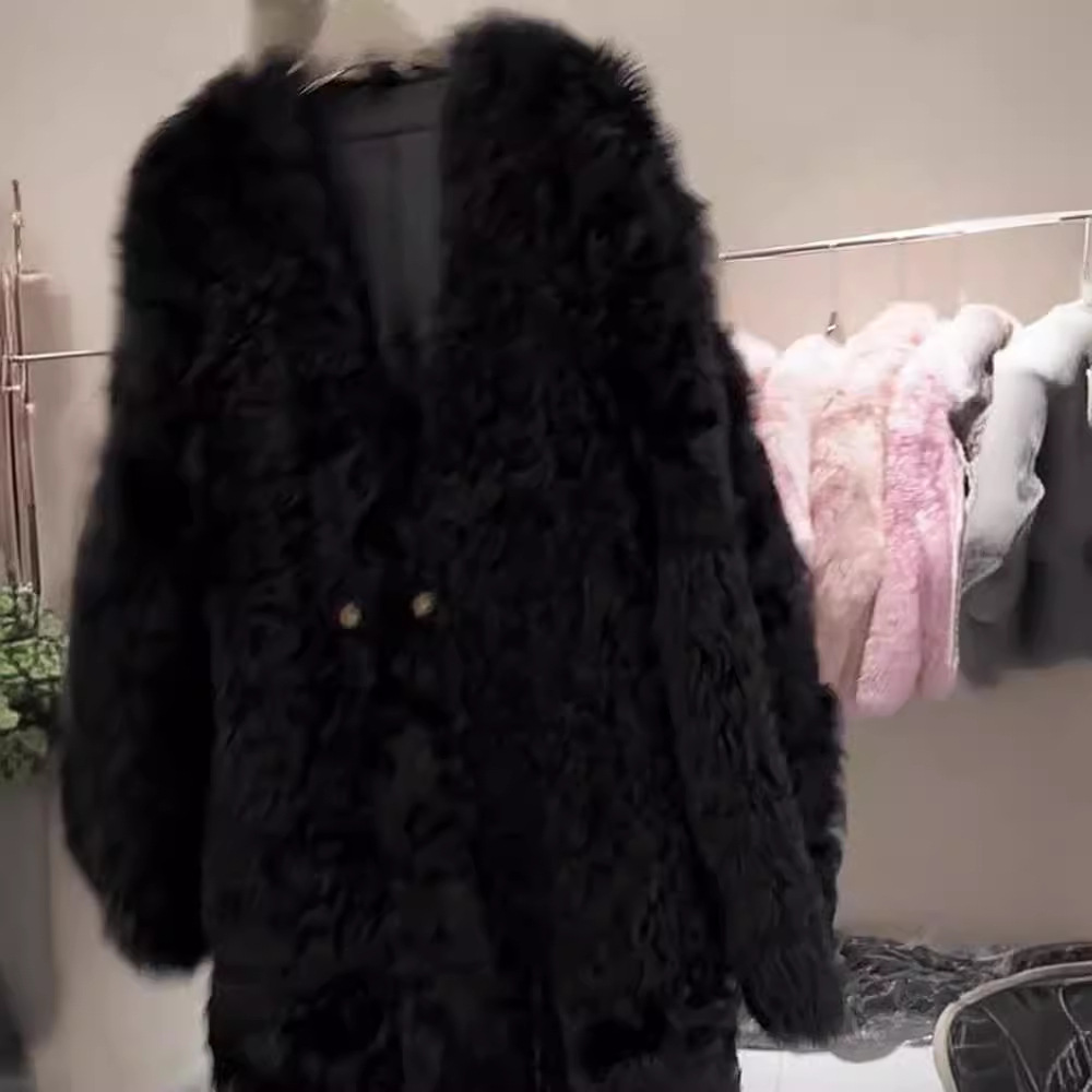 Mori European goods 2023 autumn and winter New elegant socialite High sense small black long lamb wool coat for women