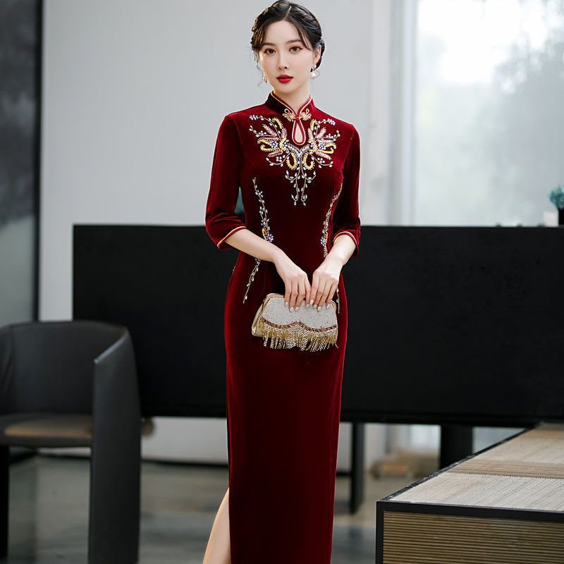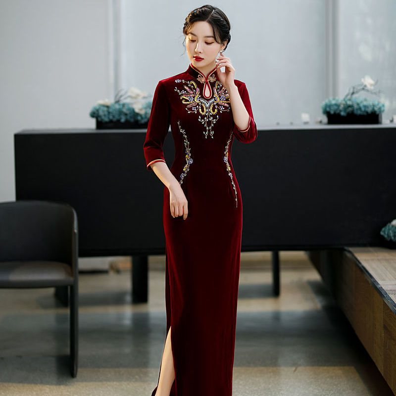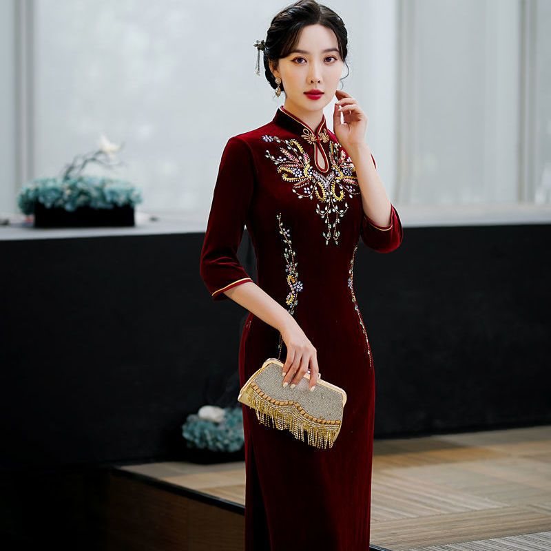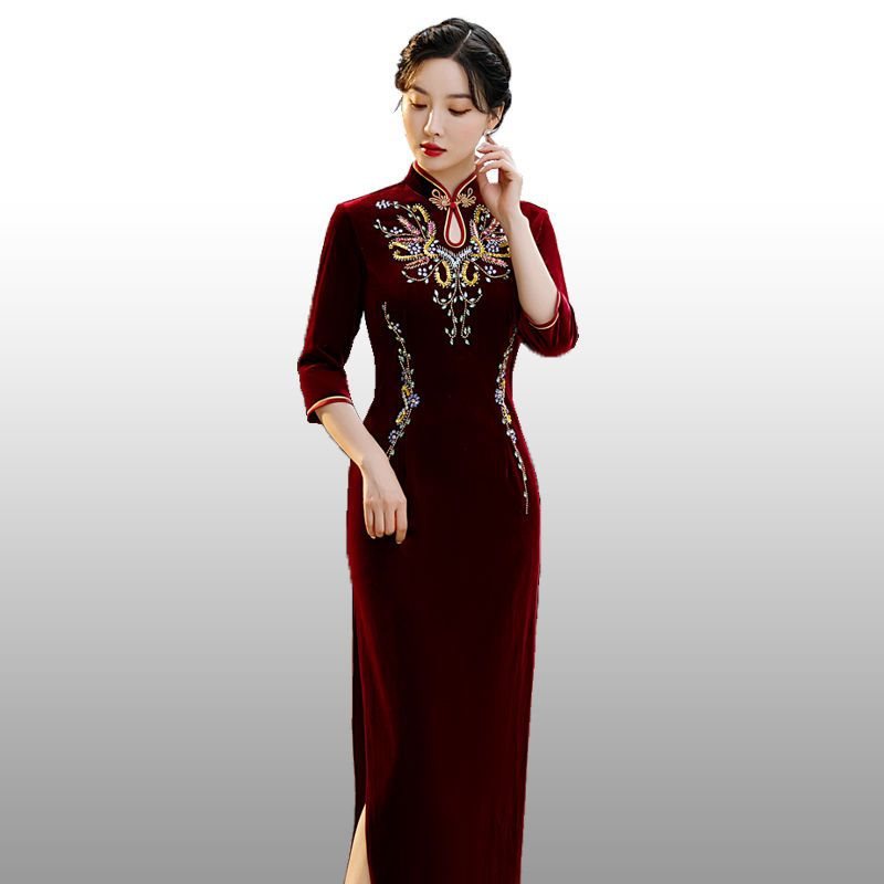| nameOriginal | Mother-in-law red catwalk gold velvet long cheongsam handmade beaded seven sleeve improved mother dress dress |