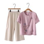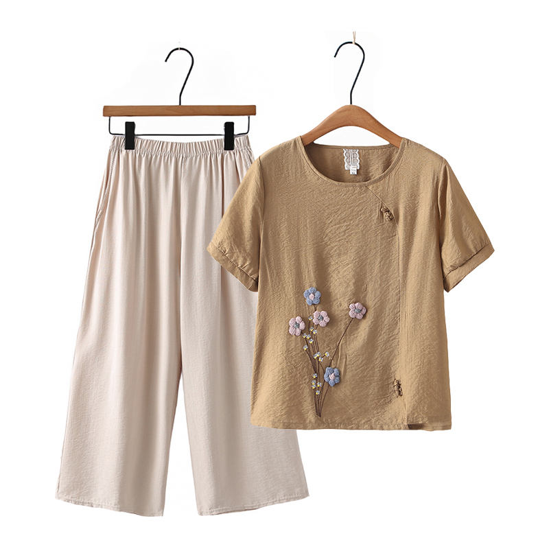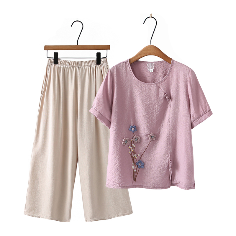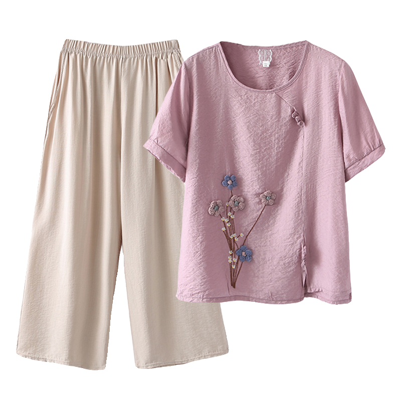 | nameOriginal | Mother Summer Dress Western Style suit Women's Cotton and Linen Embroidered Top Short-sleeved T-shirt Middle-aged and Elderly Casual plus size Two-piece Set |