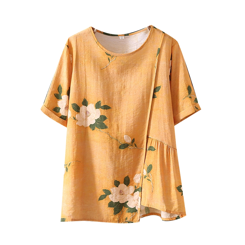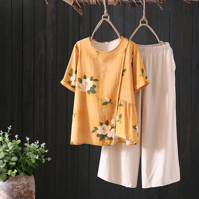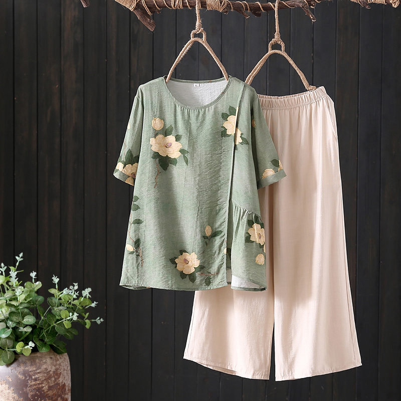 | nameOriginal | Mother summer retro cotton linen suit top middle-aged and elderly women's short sleeve T-shirt wide leg pants two-piece 2024 new |