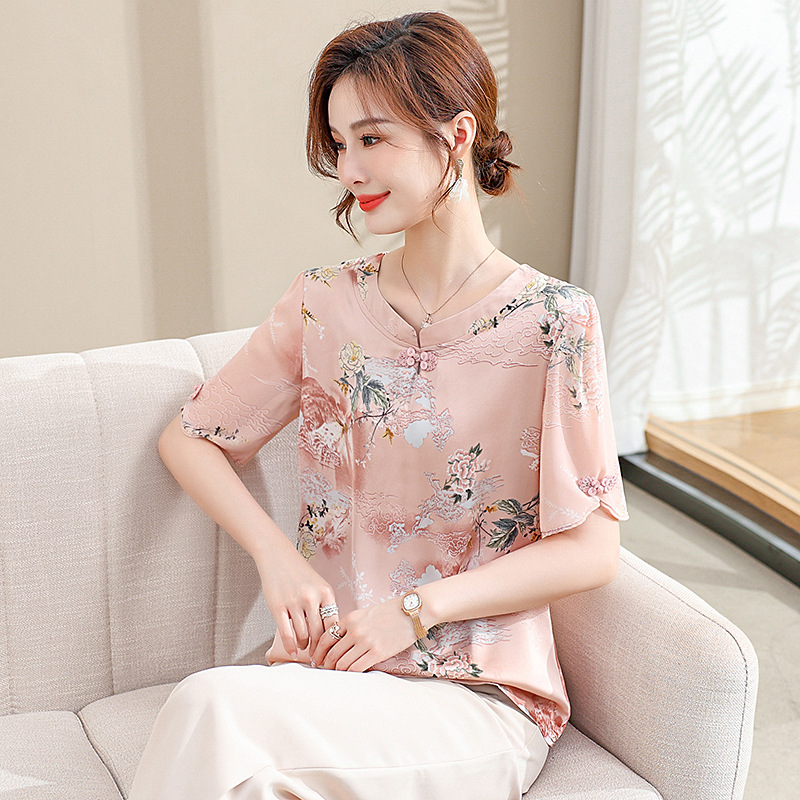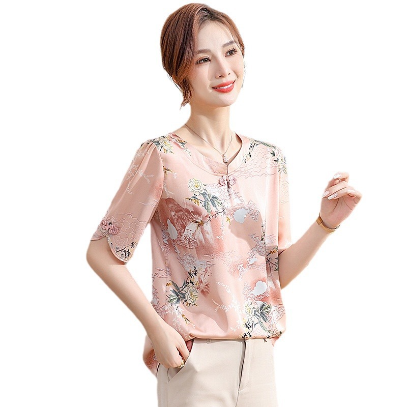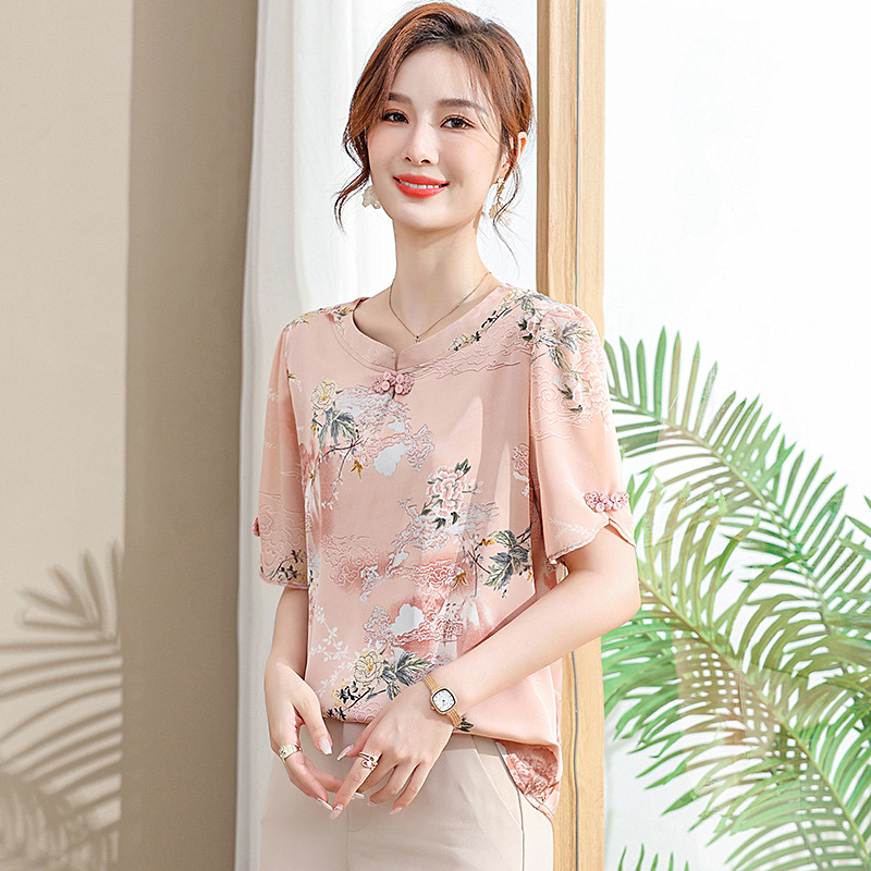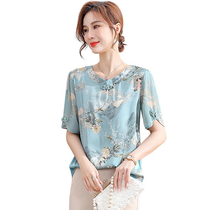 | nameOriginal | Mother Summer suit Chiffon Printed Small Shirt New Middle-aged and Elderly Low Collar Summer Seven-Sleeve Tang Coat Women's Top |