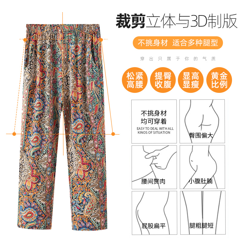 | nameOriginal | Mother's Flower Pants Summer Thin Ankle-length Pants Ice Silk Middle-aged and Elderly Women's Pants Loose Straight Pants High Waist Stomach Pants |