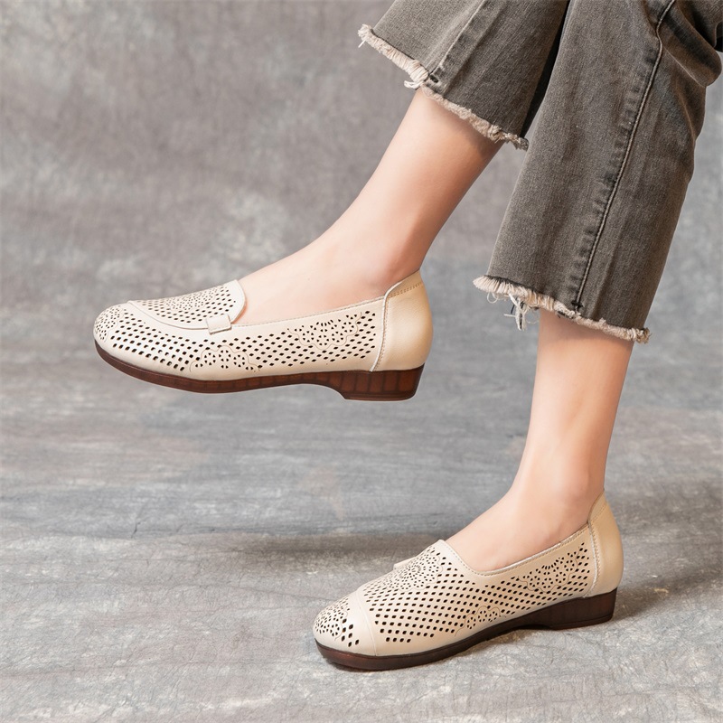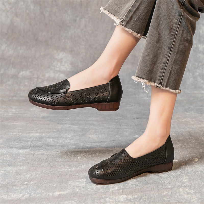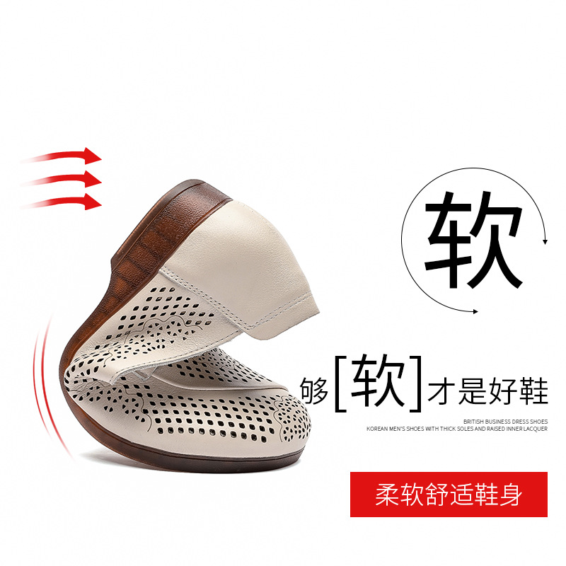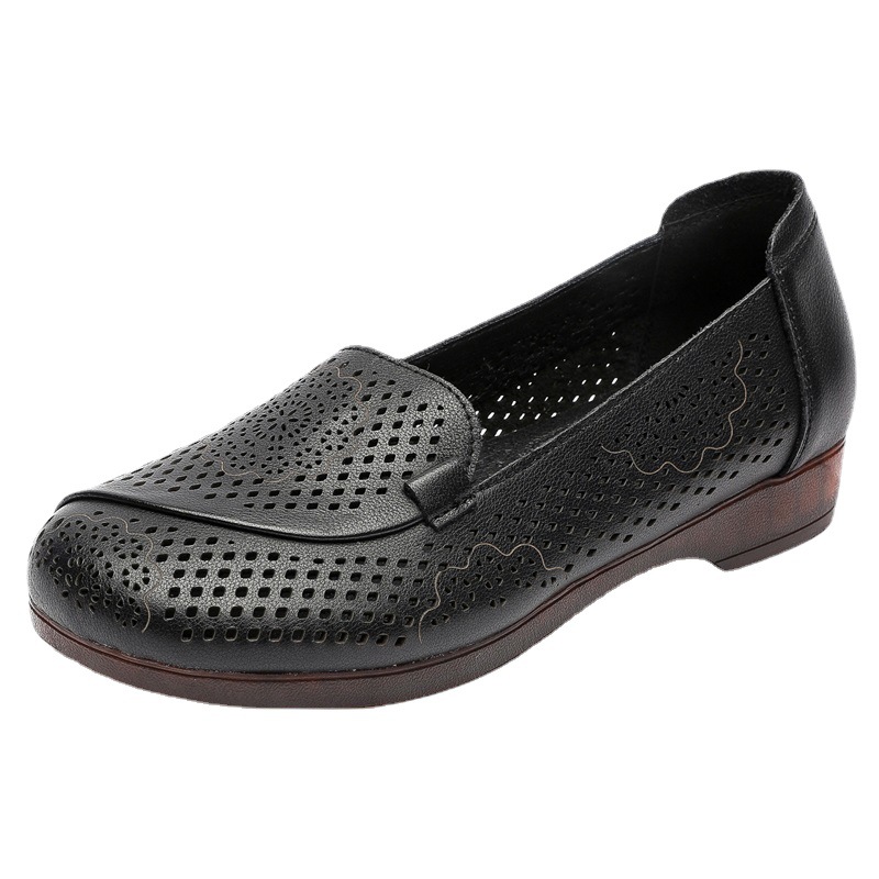 Mother's Sandals New Genuine Leather Hollow Soft Bottom Thick Low Heel Old People's Shoes with Hole Breathable Low Mouth Single Shoes for Grandma Women