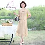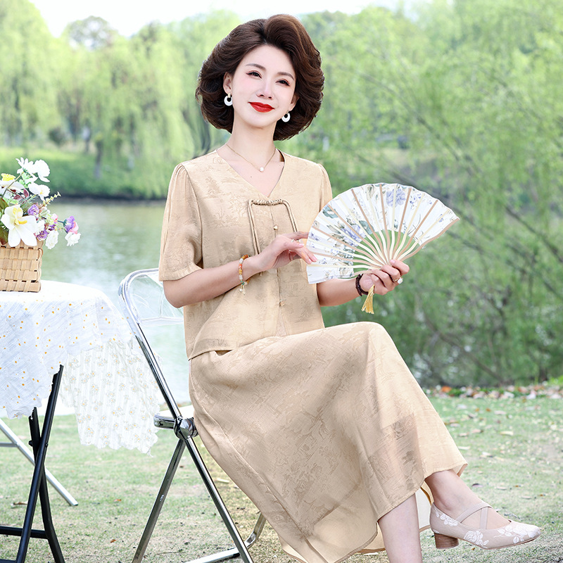 | nameOriginal | Mother's Summer Chiffon dress suit 2024 New Chinese Style National Style Short Sleeve Top Western Style Middle-aged Women's Dress |