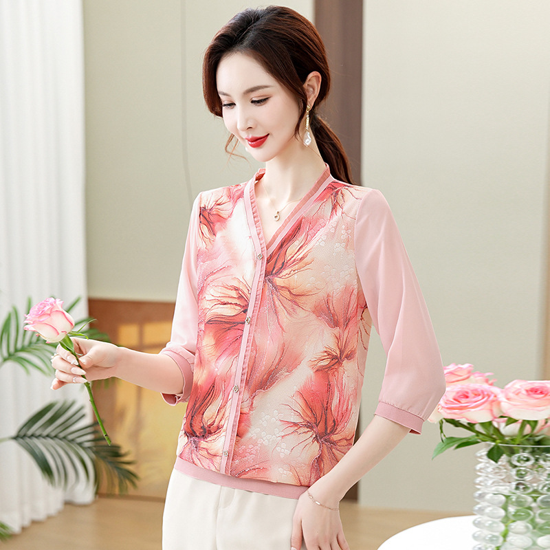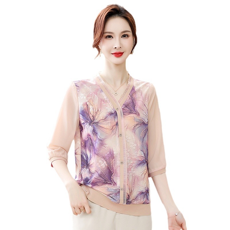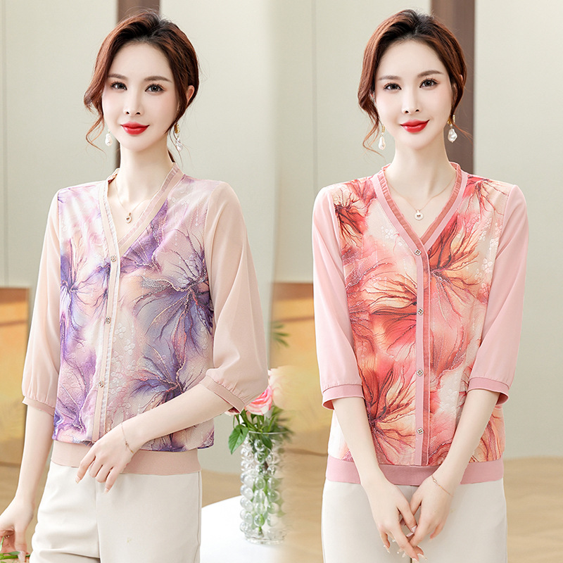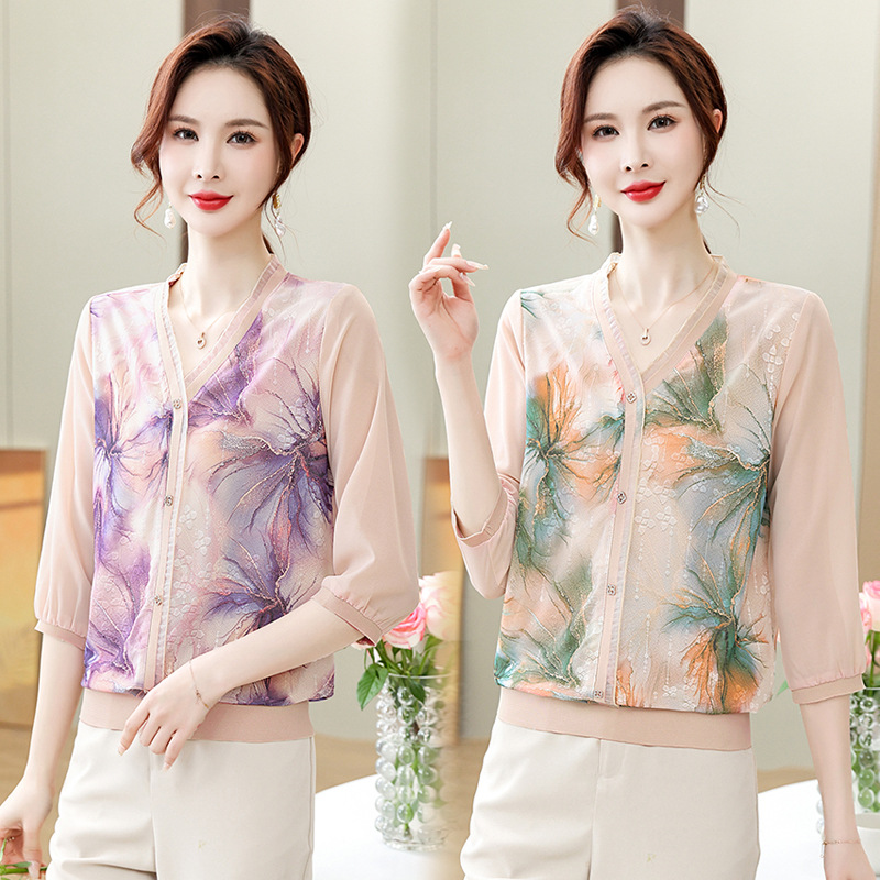 | nameOriginal | Mother's Summer Dress Seven-Sleeve Age-Reducing Top 2024 New Fashion Western Style Small Shirt Middle-aged and Elderly Women's V-neck Thin T-shirt |
