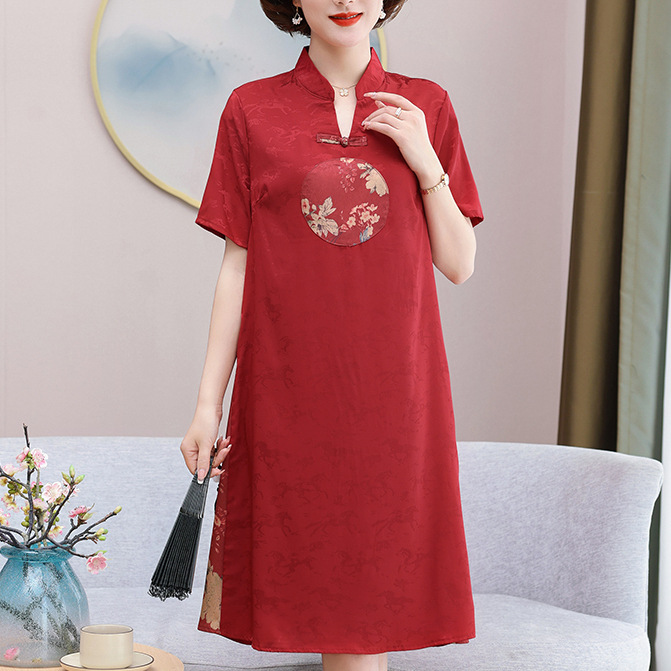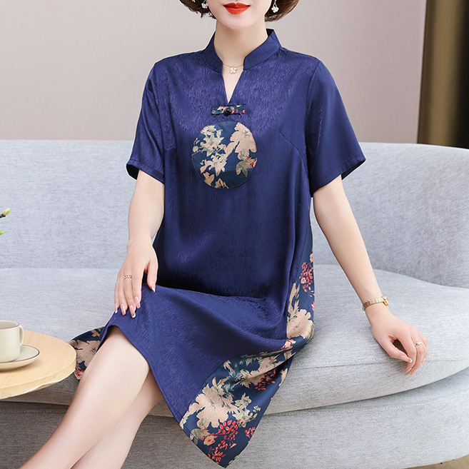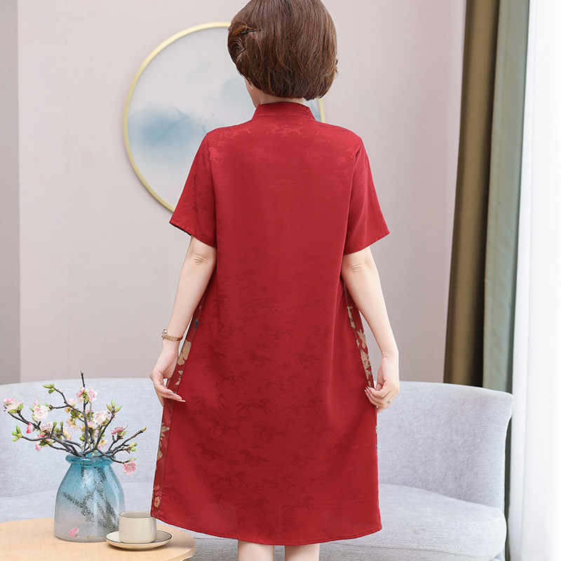 Mother's Summer Dress Silk dress Middle-aged Women's Festive Cheongsam Dress Middle-aged and Elderly Mother-in-law Summer Long Dress