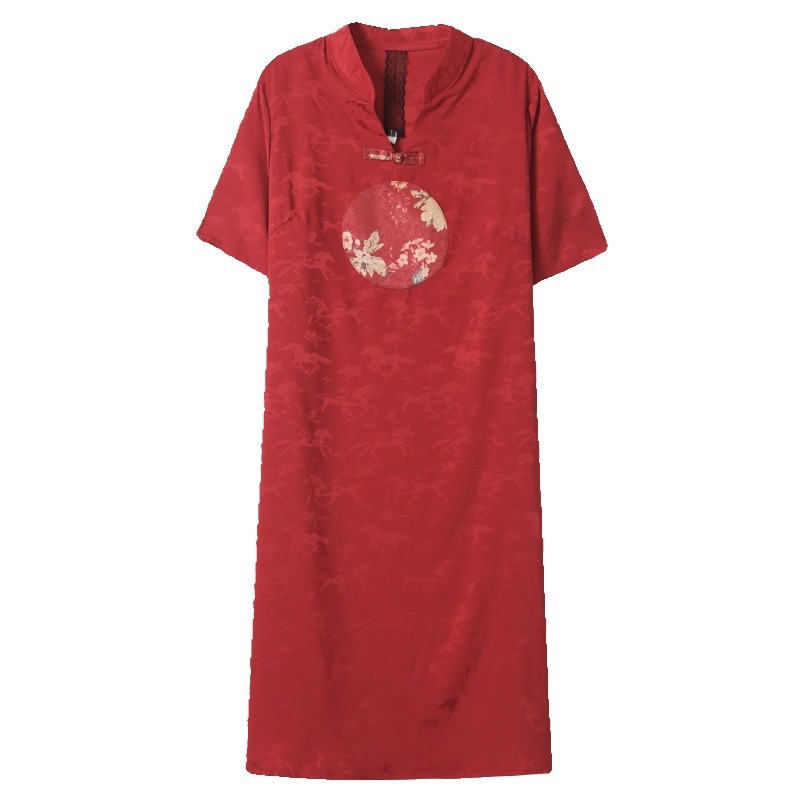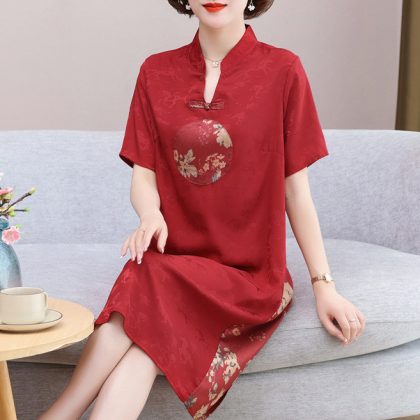 Mother’s Summer Dress Silk dress Middle-aged Women’s Festive Cheongsam Dress Middle-aged and Elderly Mother-in-law Summer Long Dress