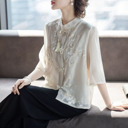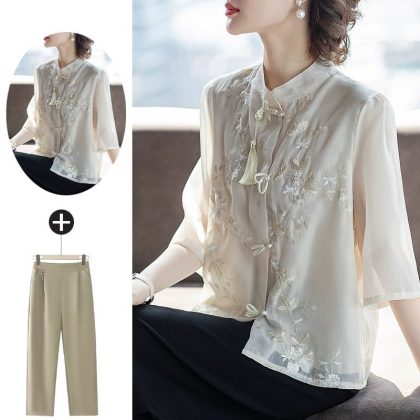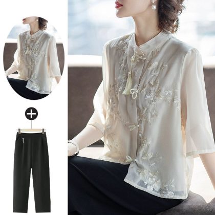 Mother’s Summer Dress suit Fashion Western Style 2024 New Middle-aged and Elderly Women’s Summer Chiffon Shirt 40-year-old Elegant Top