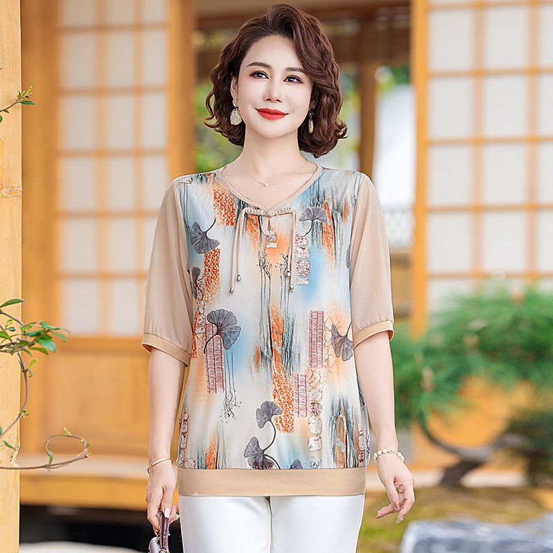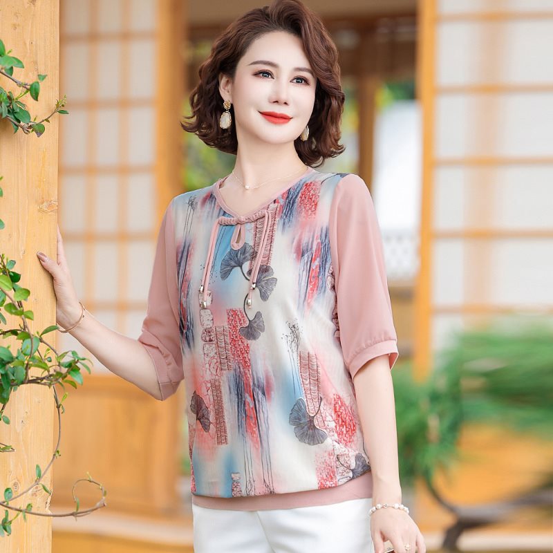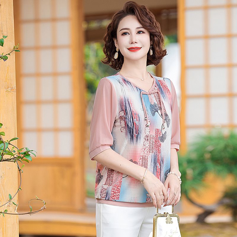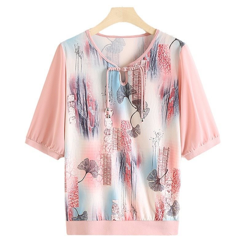 | nameOriginal | Mother's Summer Short-sleeved Bronzing Small Shirt T-shirt New Style Middle-aged and Elderly Women's 40-year-old 50 Temperament National Style Buckle Top |