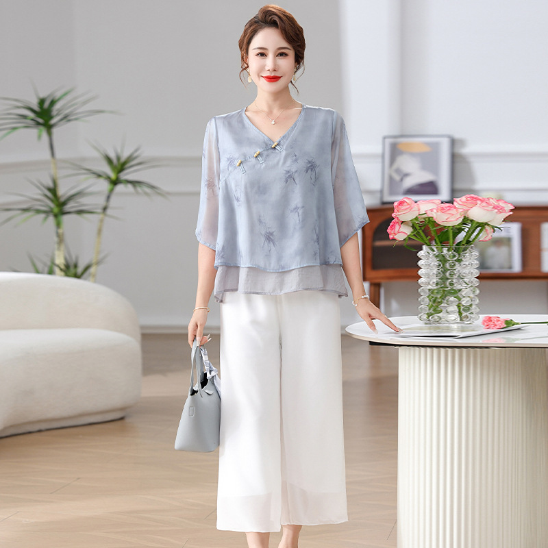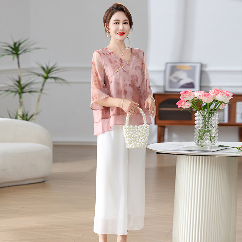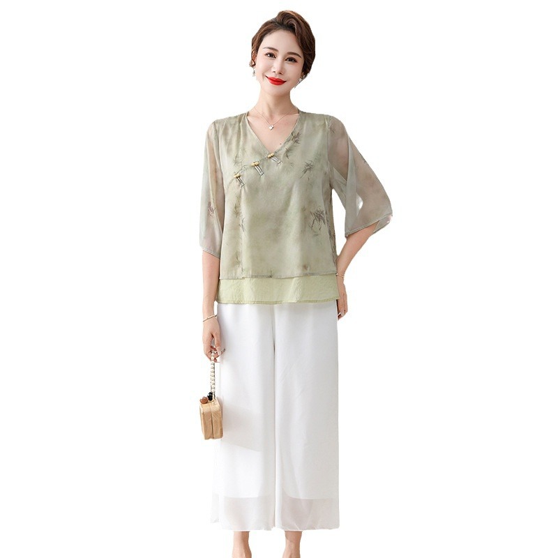 | nameOriginal | Mother's Summer suit New Chinese-style Middle-aged and Elderly Women's Summer New Slimming Fashionable Chiffon Shirt Mid-sleeve Two-piece Set |